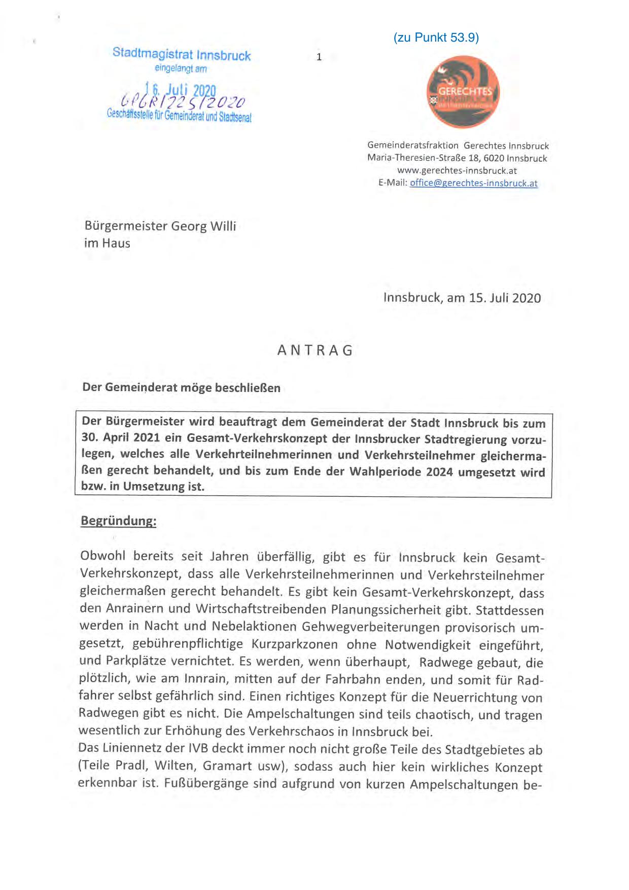 30. April 2021 ein Gesamt- Verkehrskonzept der Innsbrucker Stadtregierung vorzulegen, welches alle Verkehrteilnehmerinnen und Verkehrsteilnehmer gleichermaßen gerecht behandelt, und bis zum Ende der Wahlperiode 2024 umgesetzt wird