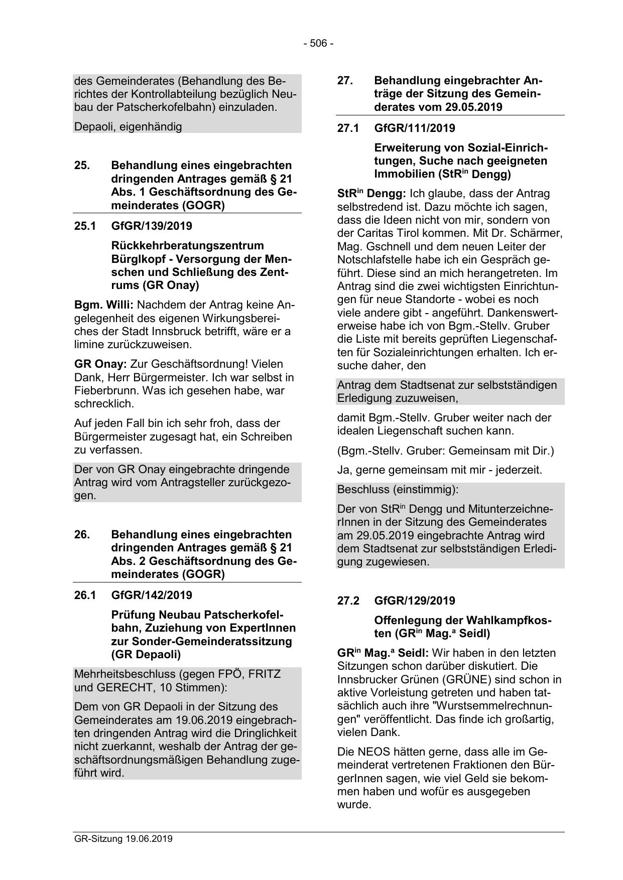 Bgm. Willi: Nachdem der Antrag keine Angelegenheit des eigenen Wirkungsbereiches der Stadt Innsbruck betrifft, wäre er a