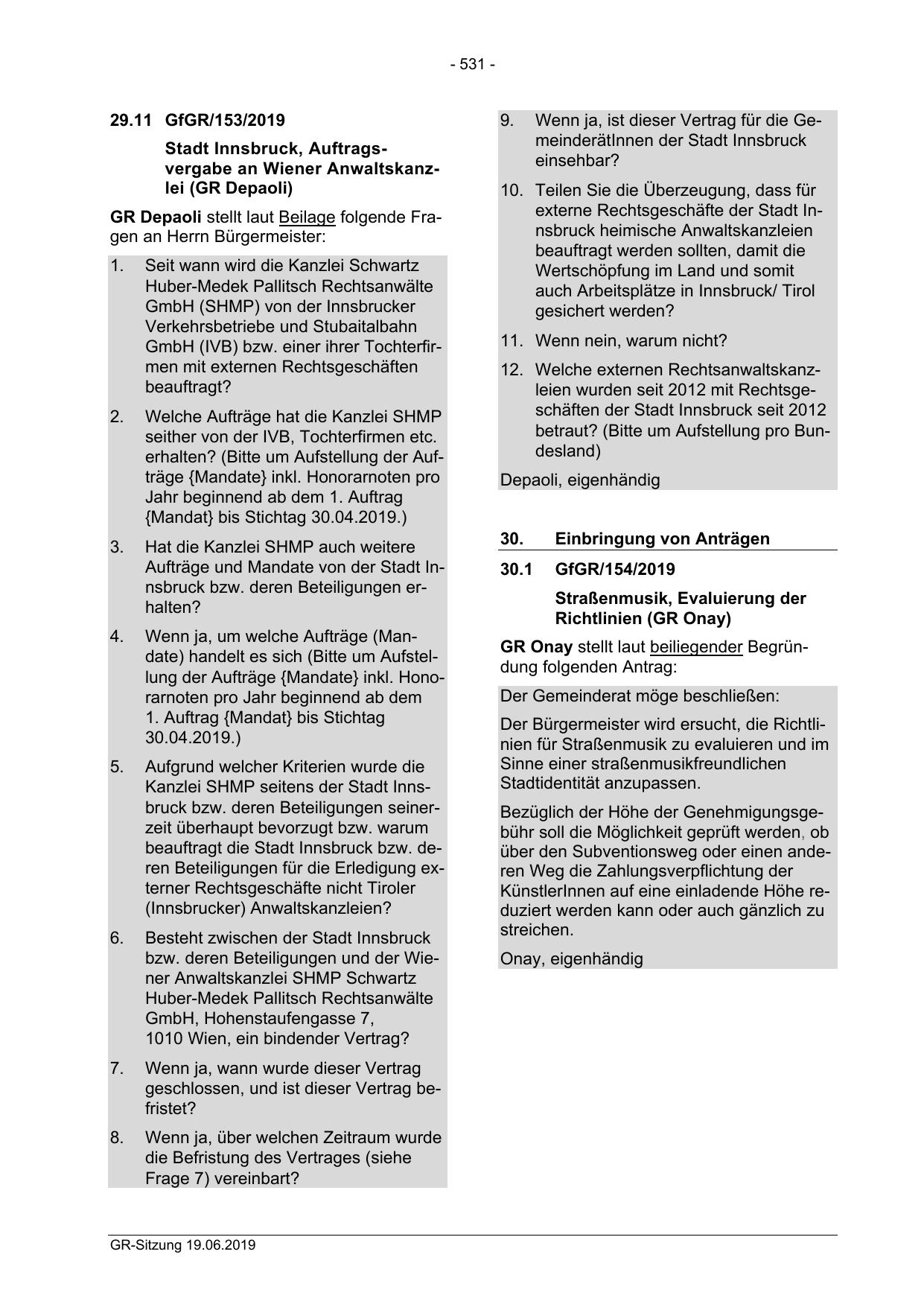 Stadt Innsbruck, Auftragsvergabe an Wiener Anwaltskanzlei (GR Depaoli)