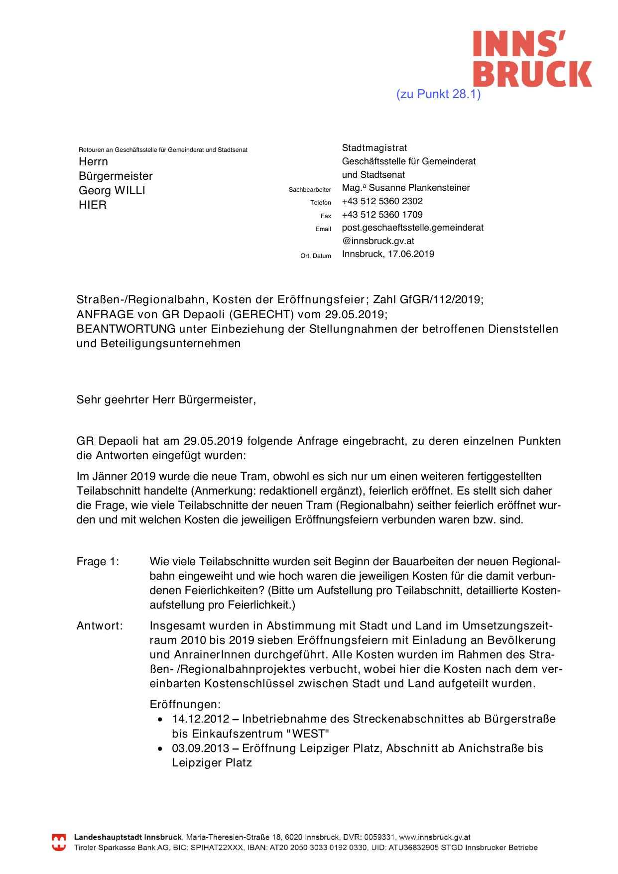 GR Depaoli hat am 29.05.2019 folgende Anfrage eingebracht, zu deren einzelnen Punkten