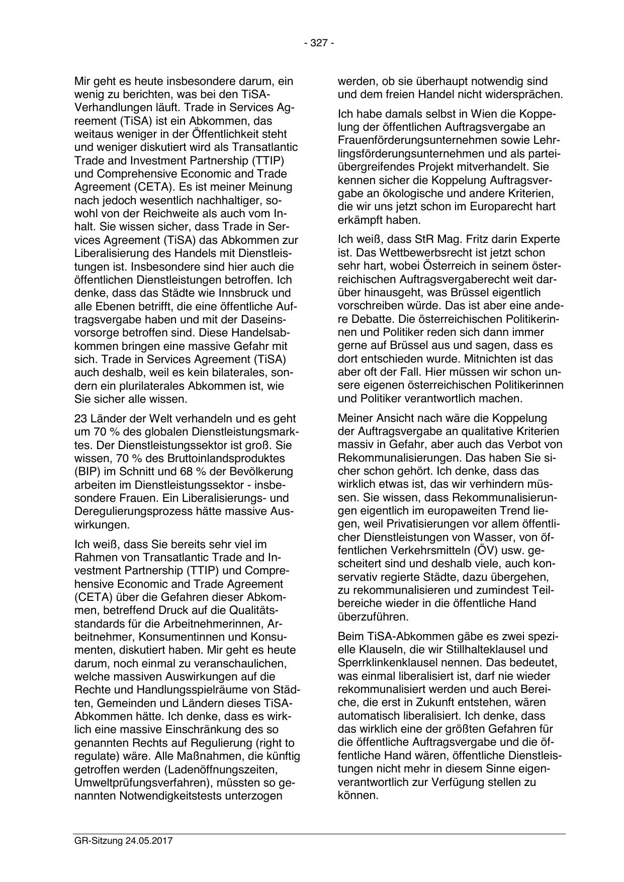 Rechte und Handlungsspielräume von Städten, Gemeinden und Ländern dieses TiSAAbkommen hätte. Ich denke, dass es wirklich eine massive Einschränkung des so