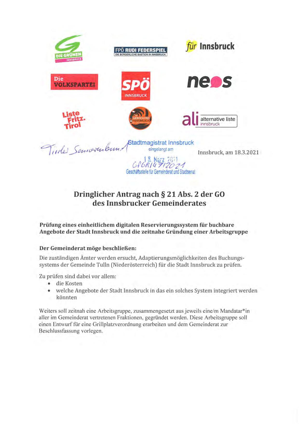 Die zuständigen Ämter werden ersucht, Adaptierungsmöglichkeiten des Buchungssystems der Gemeinde Tulln (Niederösterreich) für die Stadt Innsbruck zu prüfen.