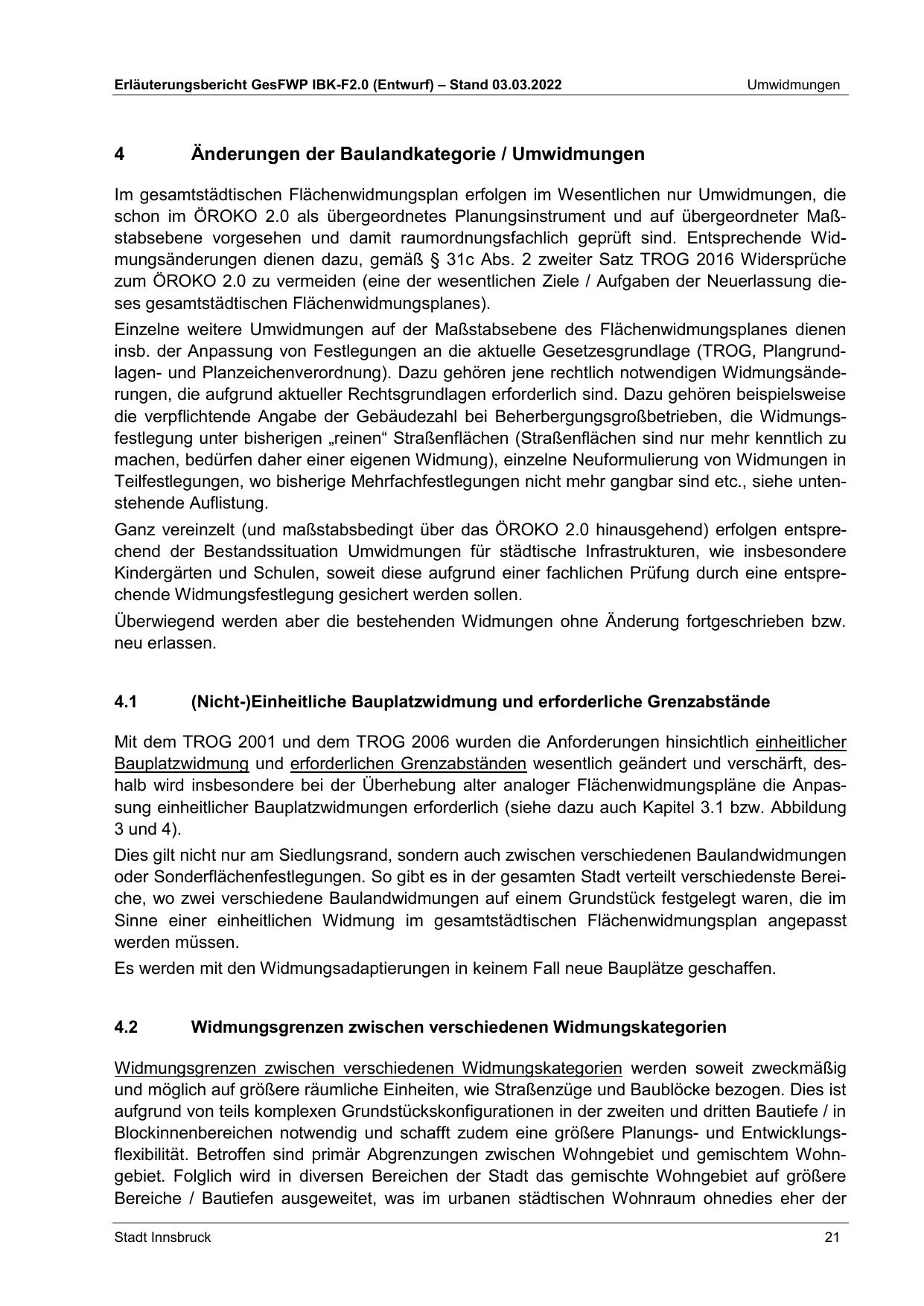 insb. der Anpassung von Festlegungen an die aktuelle Gesetzesgrundlage (TROG, Plangrundlagen- und Planzeichenverordnung). Dazu gehören jene rechtlich notwendigen Widmungsänderungen, die aufgrund aktueller Rechtsgrundlagen erforderlich sind. Dazu gehören beispielsweise