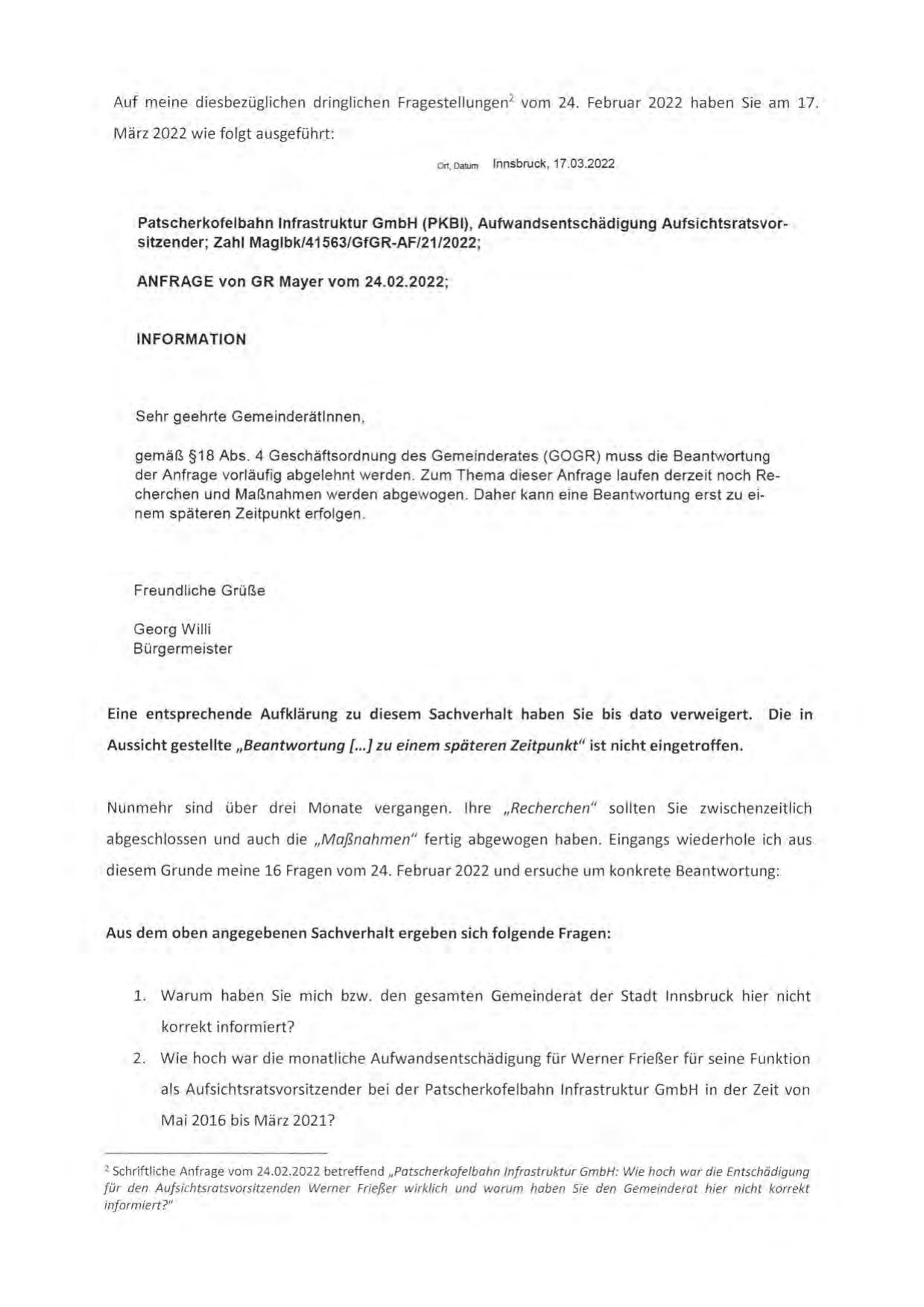 2 Schriftliche Anfrage vom 24.02.2022 betreffend „Patscherkofelbahn Infrastruktur GmbH: Wie hoch war die Entschädigung