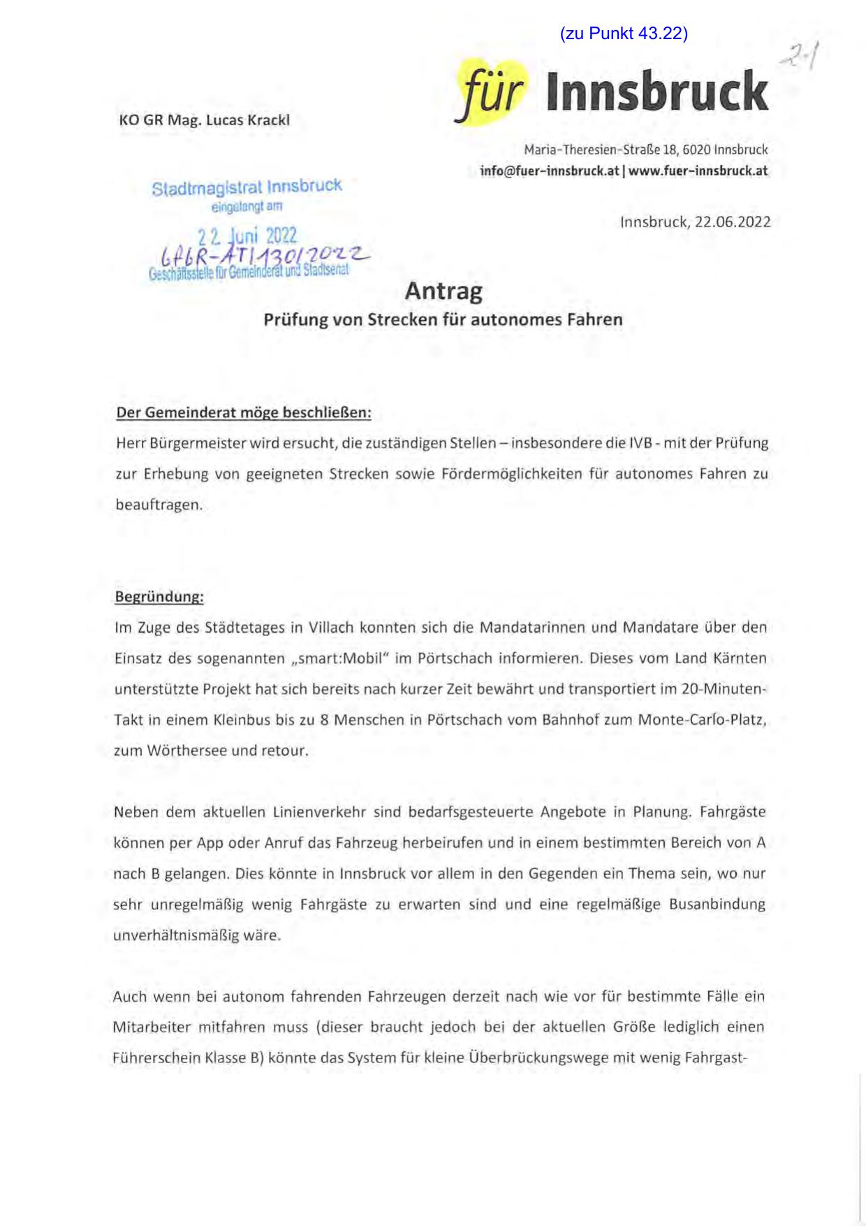Herr Bürgermeister wird ersucht, die zuständigen Stellen - insbesondere die IVB - mit der Prüfung