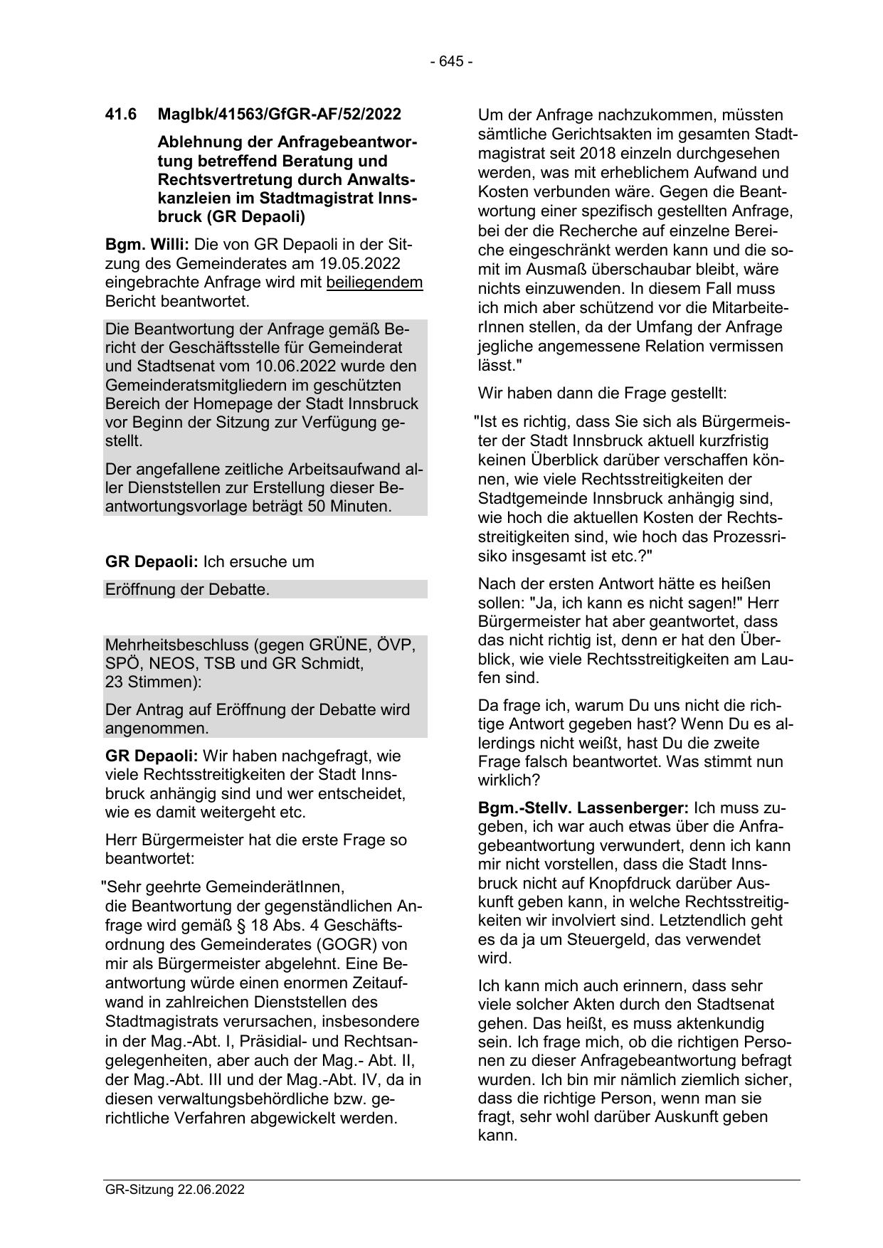 Bgm. Willi: Die von GR Depaoli in der Sitzung des Gemeinderates am 19.05.2022