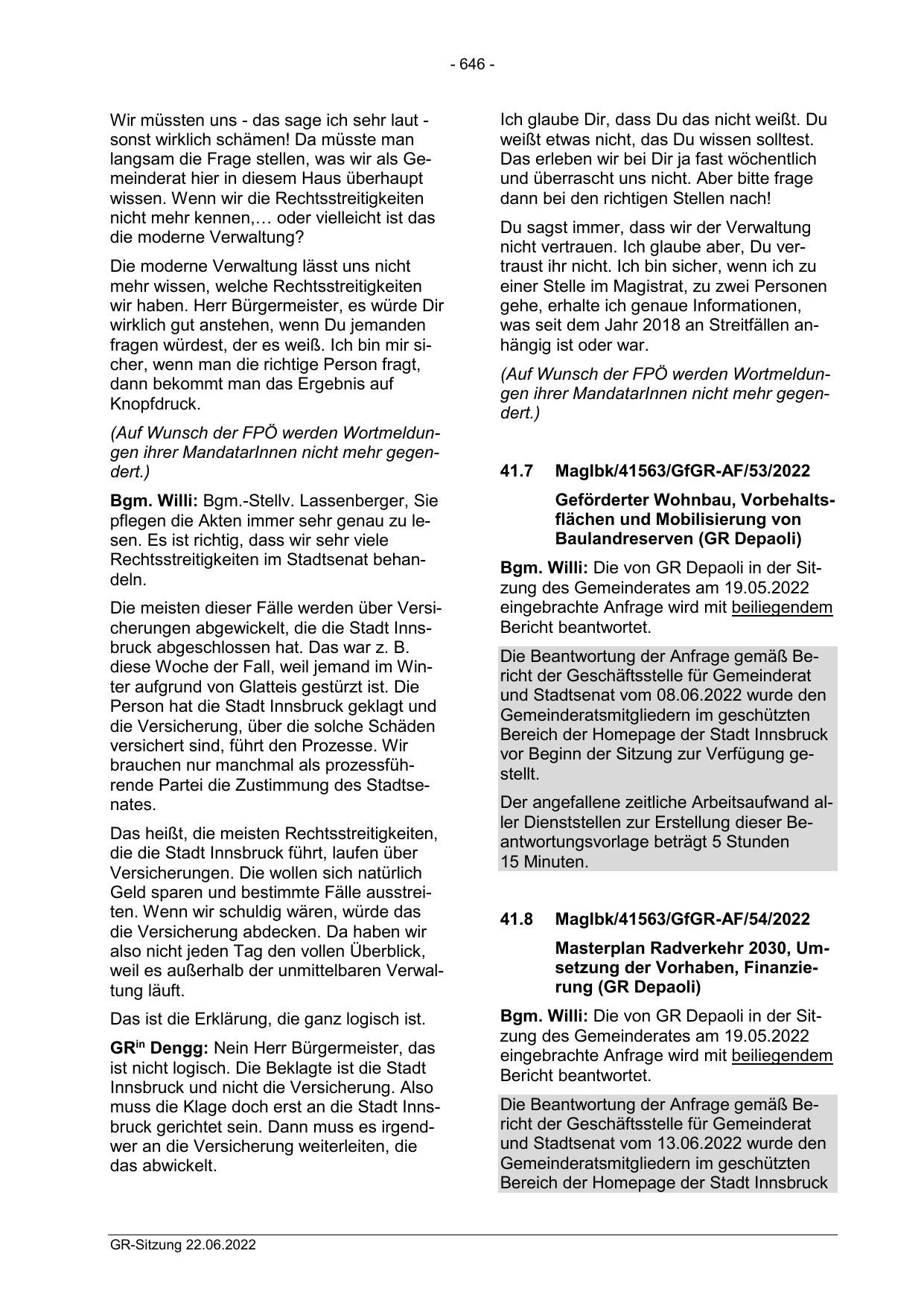 Bgm. Willi: Die von GR Depaoli in der Sitzung des Gemeinderates am 19.05.2022