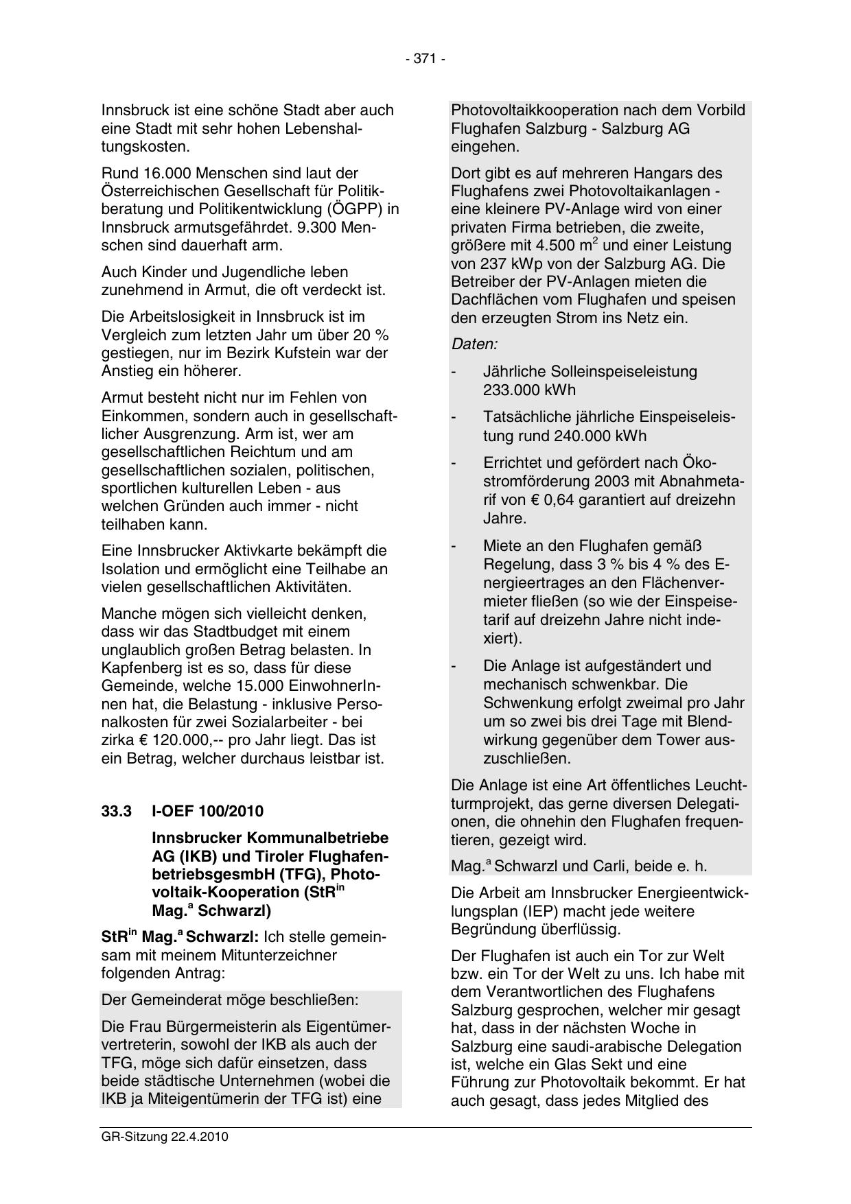 AG (IKB) und Tiroler FlughafenbetriebsgesmbH (TFG), Photovoltaik-Kooperation (StRin