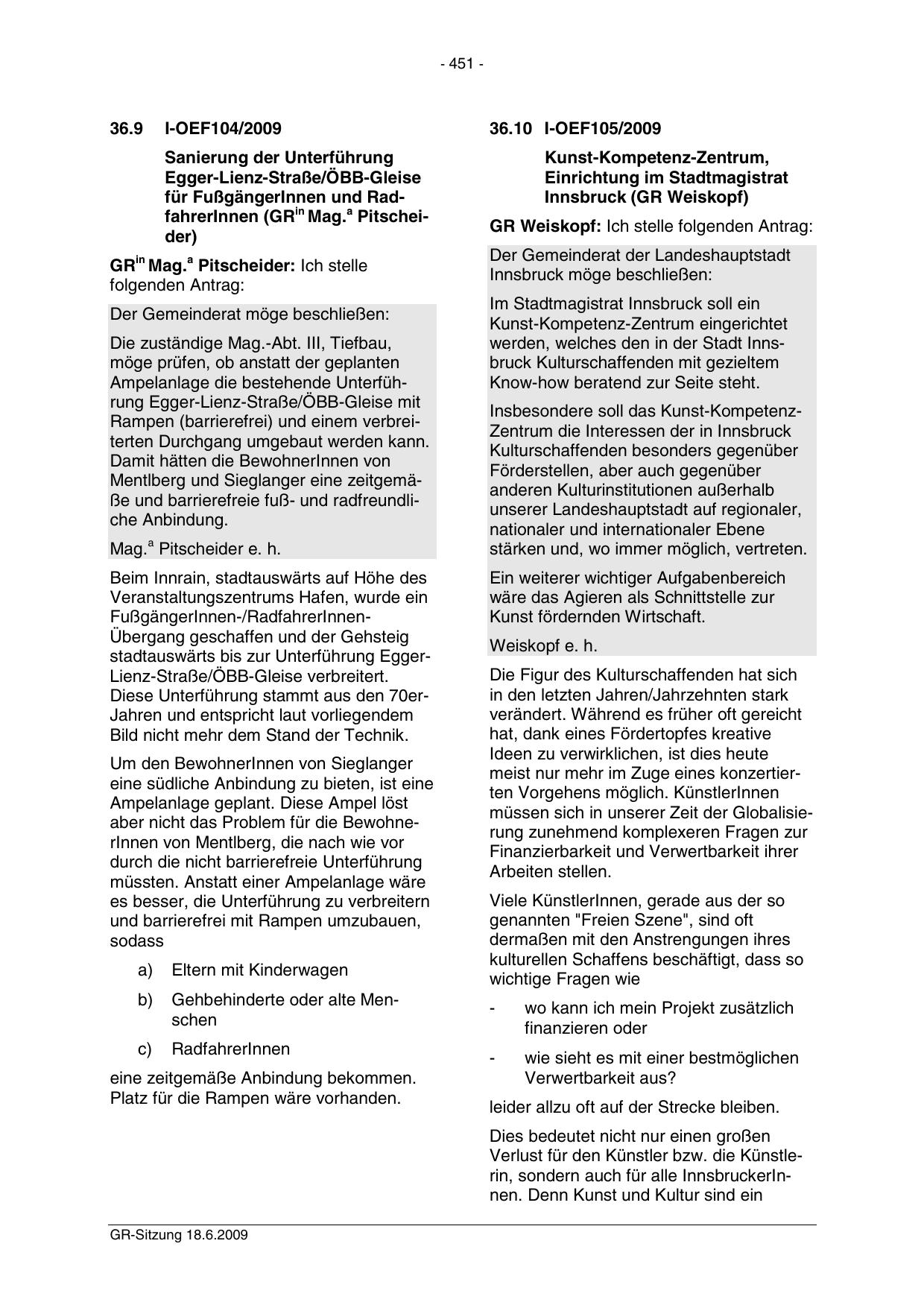 Verlust für den Künstler bzw. die Künstlerin, sondern auch für alle InnsbruckerInnen. Denn Kunst und Kultur sind ein