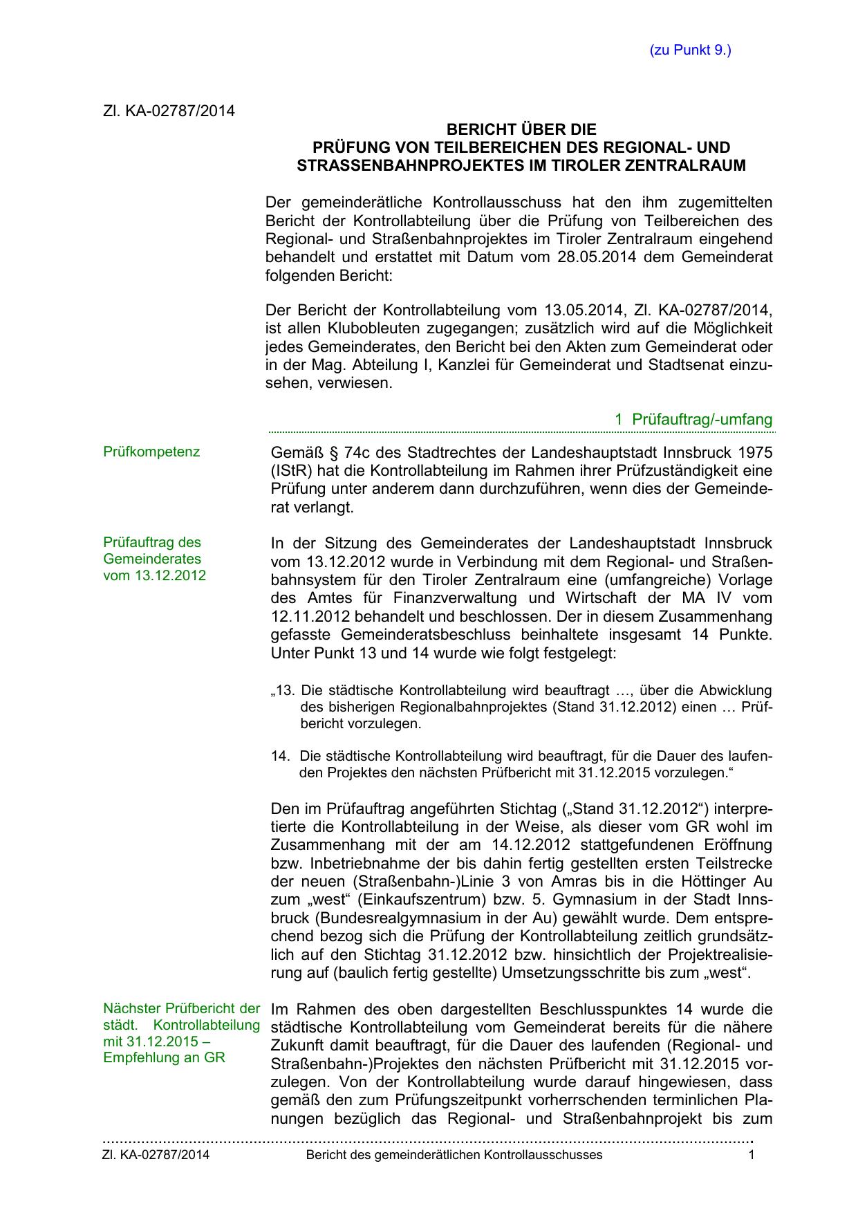 Straßenbahn-)Projektes den nächsten Prüfbericht mit 31.12.2015 vorzulegen. Von der Kontrollabteilung wurde darauf hingewiesen, dass