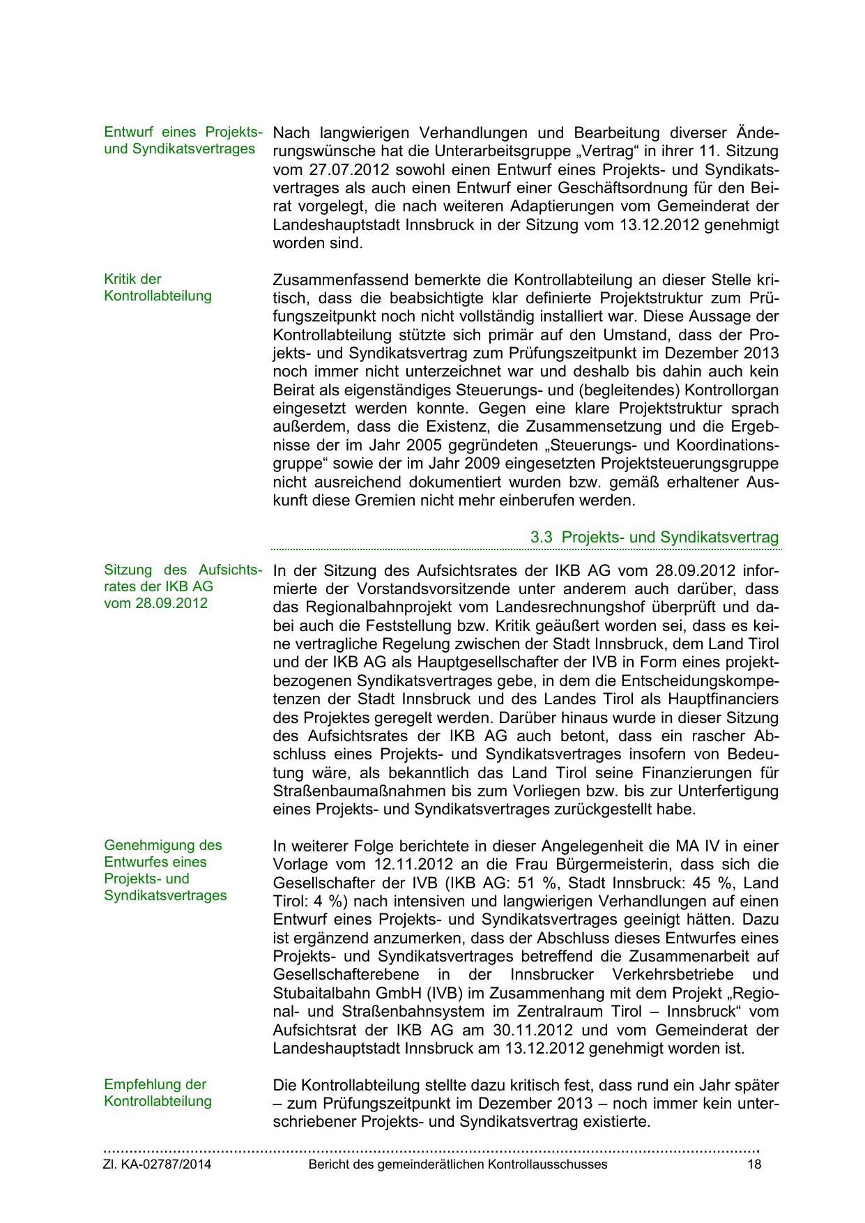 und der IKB AG als Hauptgesellschafter der IVB in Form eines projektbezogenen Syndikatsvertrages gebe, in dem die Entscheidungskompetenzen der Stadt Innsbruck und des Landes Tirol als Hauptfinanciers