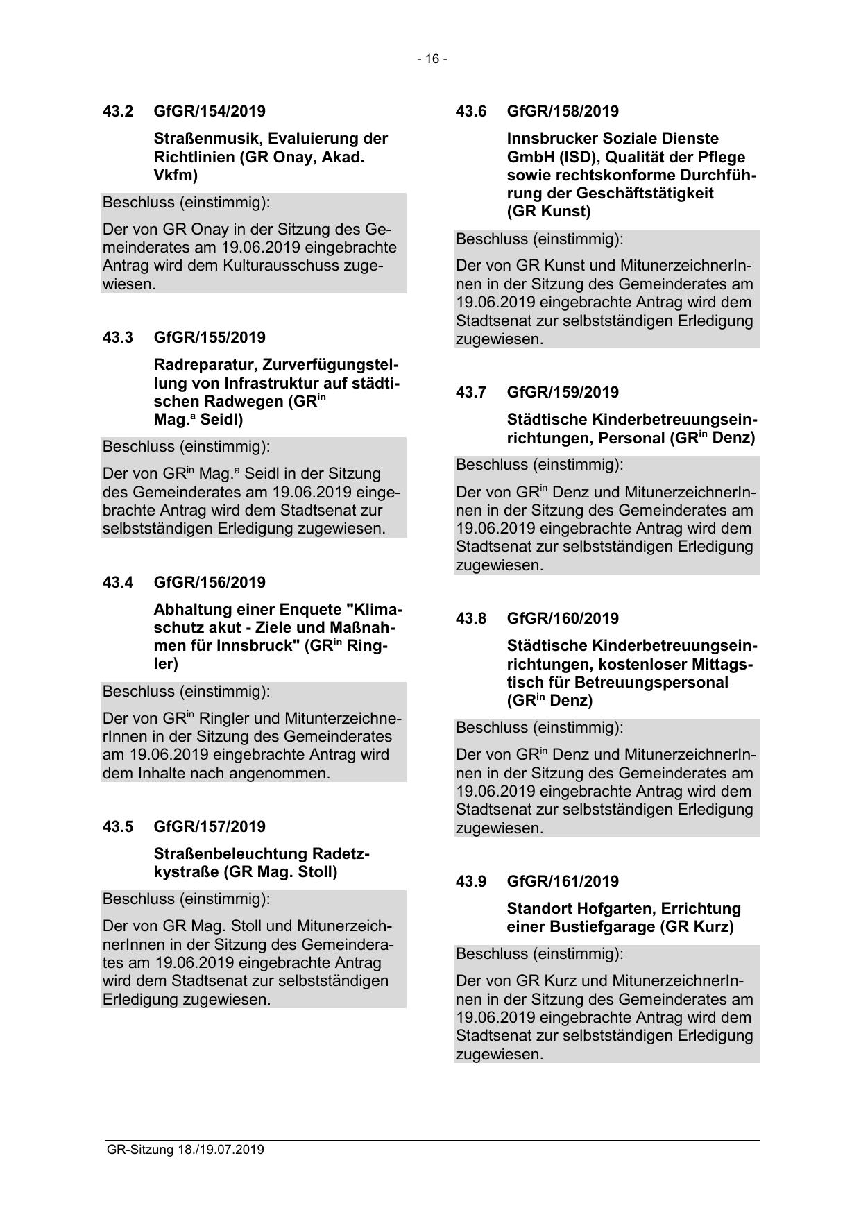 des Gemeinderates am 19.06.2019 eingebrachte Antrag wird dem Stadtsenat zur