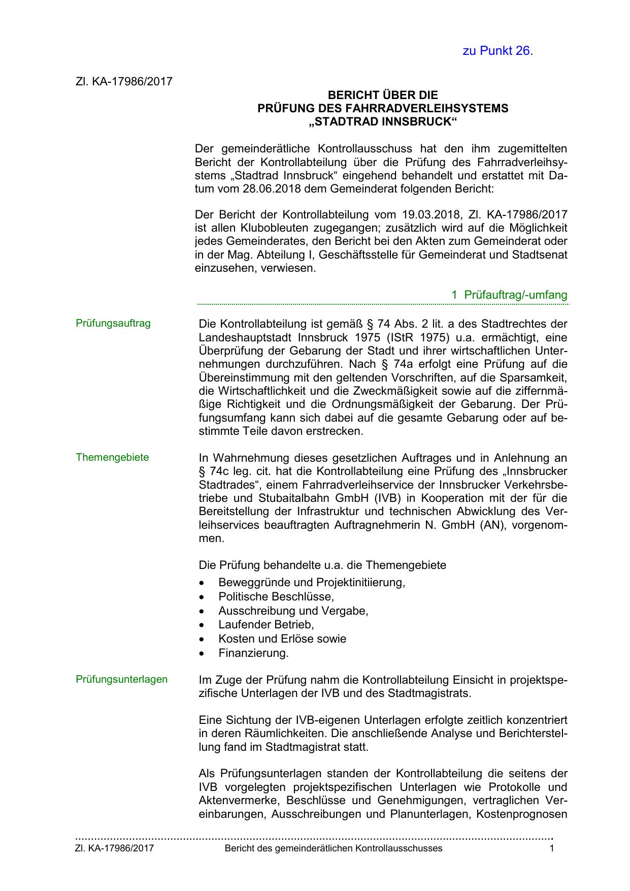 Bericht der Kontrollabteilung über die Prüfung des Fahrradverleihsystems „Stadtrad Innsbruck“ eingehend behandelt und erstattet mit Datum vom 28.06.2018 dem Gemeinderat folgenden Bericht:
