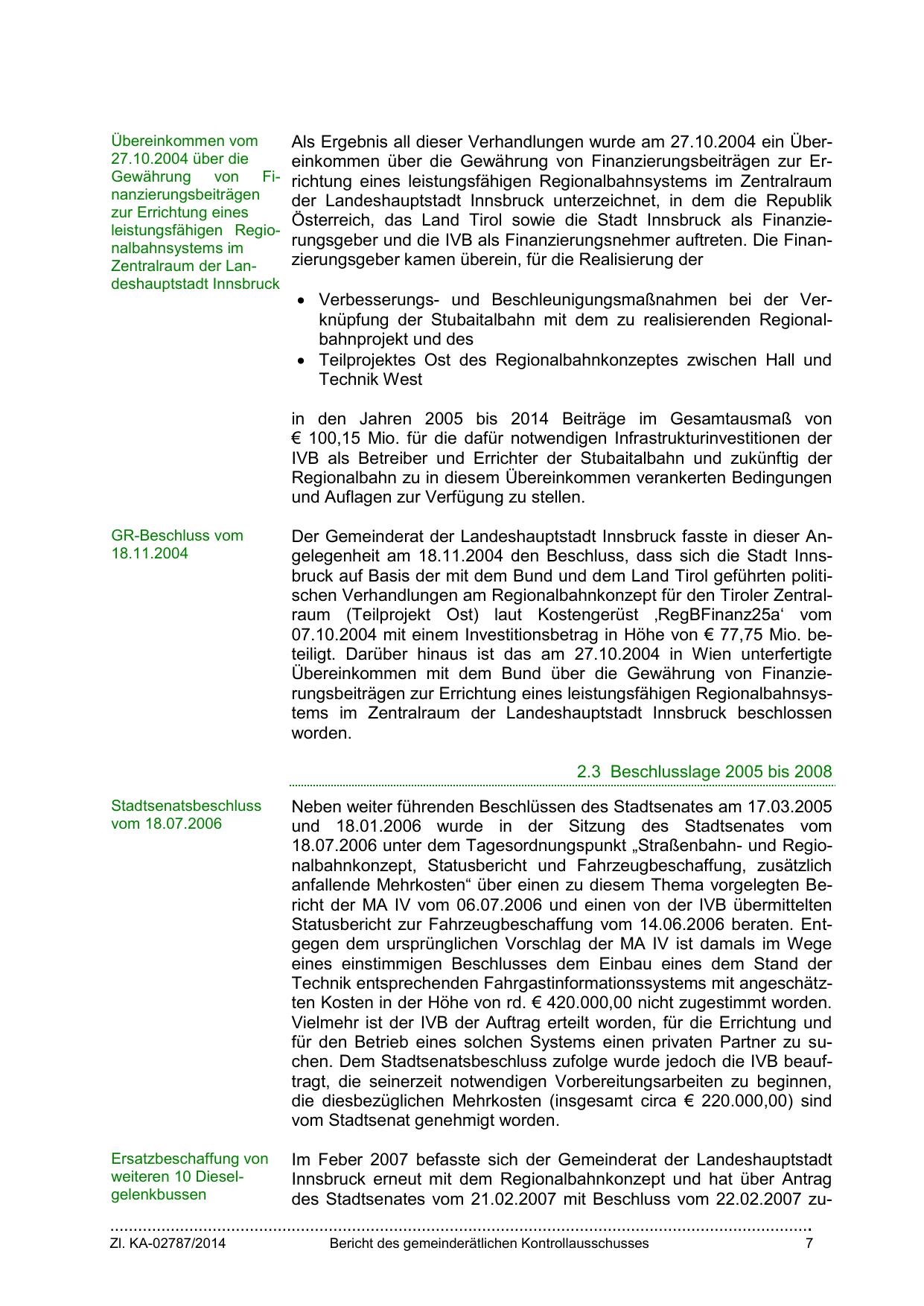 Der Gemeinderat der Landeshauptstadt Innsbruck fasste in dieser Angelegenheit am 18.11.2004 den Beschluss, dass sich die Stadt Innsbruck auf Basis der mit dem Bund und dem Land Tirol geführten politischen Verhandlungen am Regionalbahnkonzept für den Tiroler Zentralraum (Teilprojekt Ost) laut Kostengerüst ‚RegBFinanz25a‘ vom