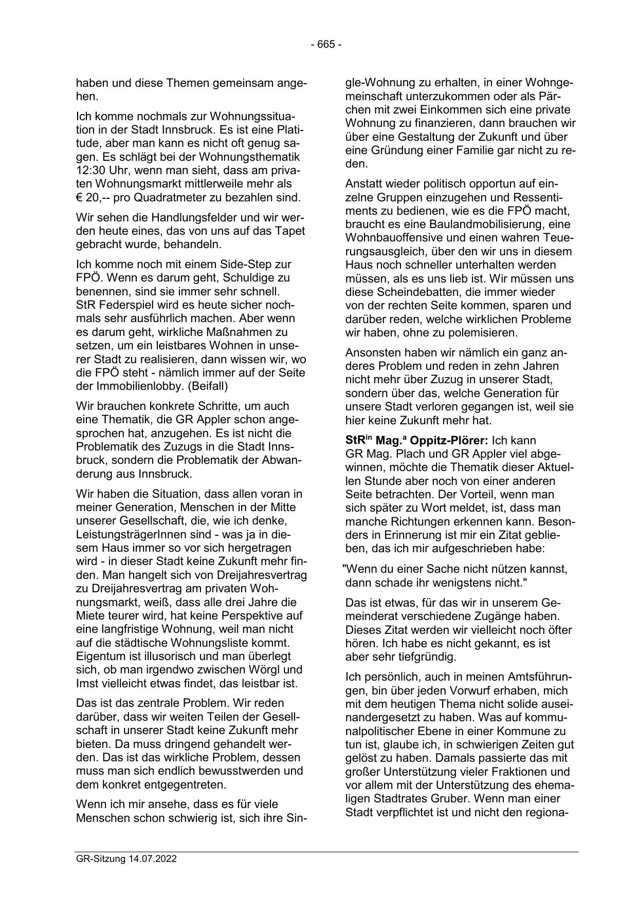 Ich komme nochmals zur Wohnungssituation in der Stadt Innsbruck. Es ist eine Platitude, aber man kann es nicht oft genug sagen. Es schlägt bei der Wohnungsthematik