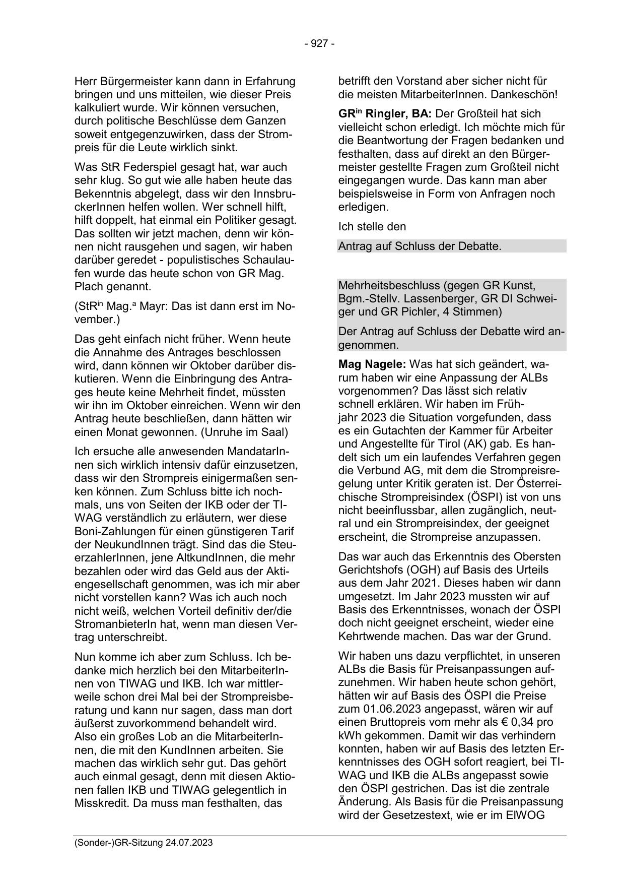 dass wir den Strompreis einigermaßen senken können. Zum Schluss bitte ich nochmals, uns von Seiten der IKB oder der TIWAG verständlich zu erläutern, wer diese