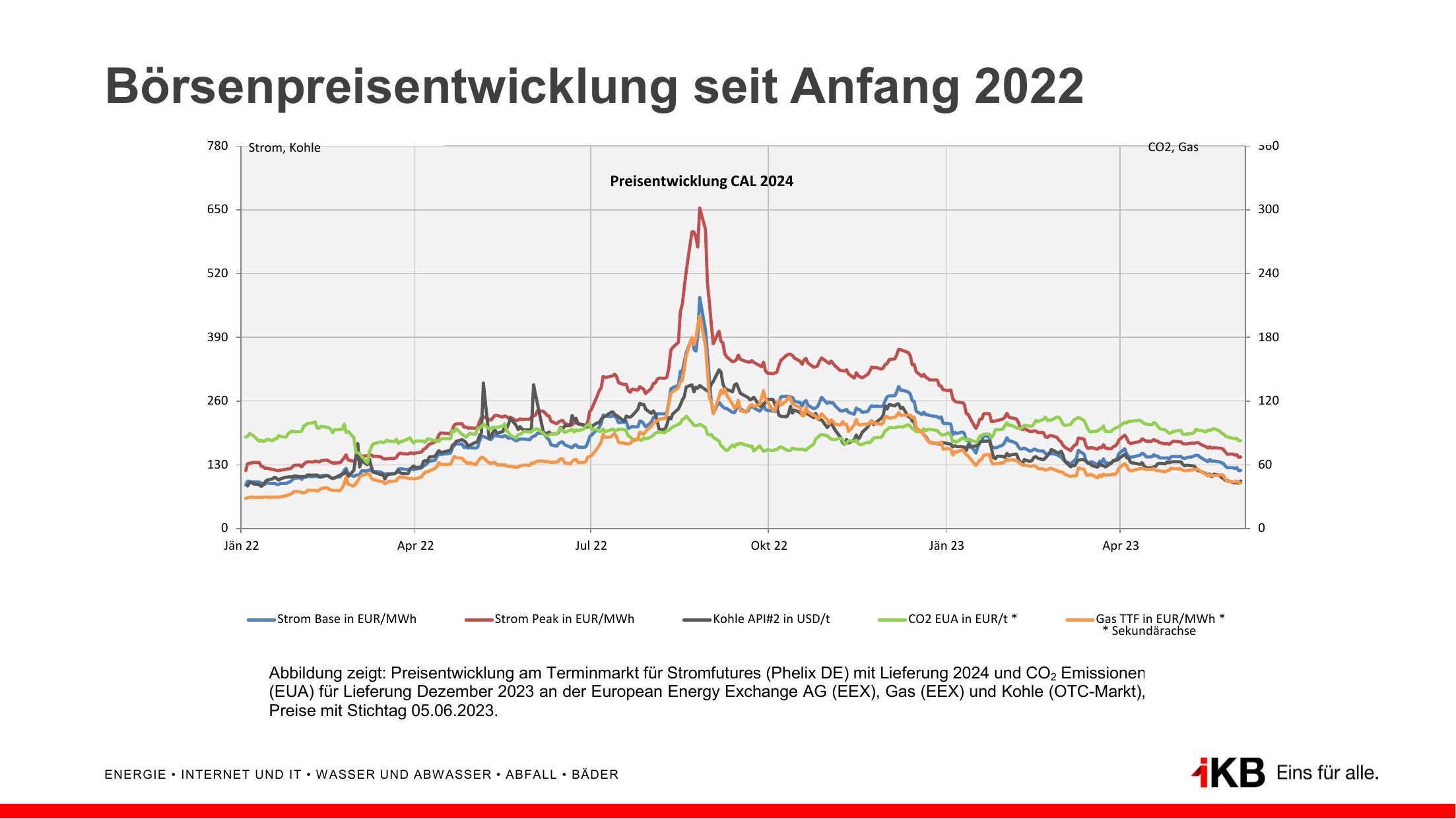 Abbildung zeigt: Preisentwicklung am Terminmarkt für Stromfutures (Phelix DE) mit Lieferung 2024 und CO2 Emissionen