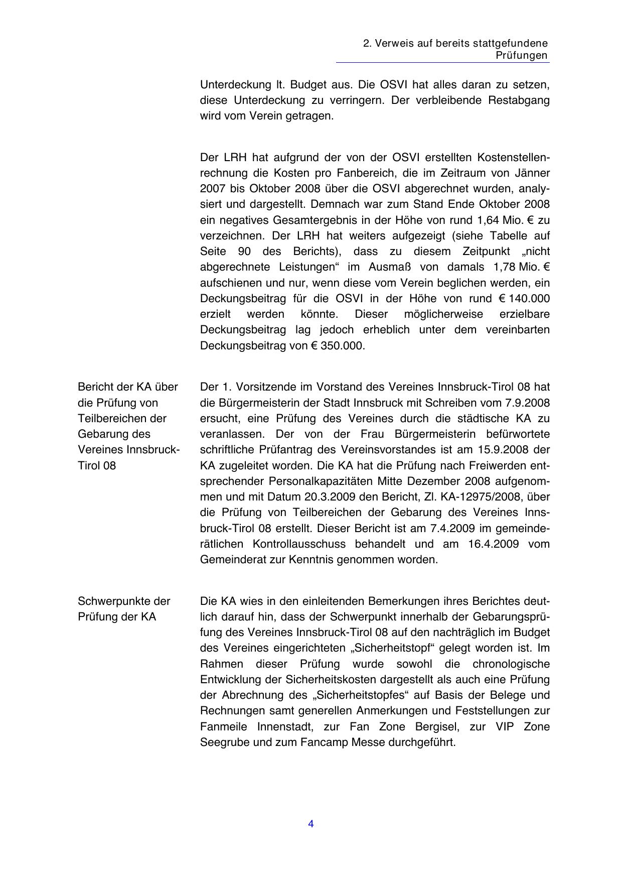 die Prüfung von Teilbereichen der Gebarung des Vereines Innsbruck-Tirol 08 erstellt. Dieser Bericht ist am 7.4.2009 im gemeinderätlichen Kontrollausschuss behandelt und am 16.4.2009 vom