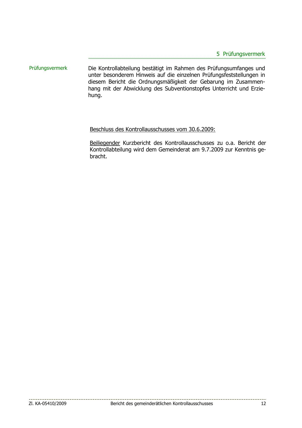 Beschluss des Kontrollausschusses vom 30.6.2009: