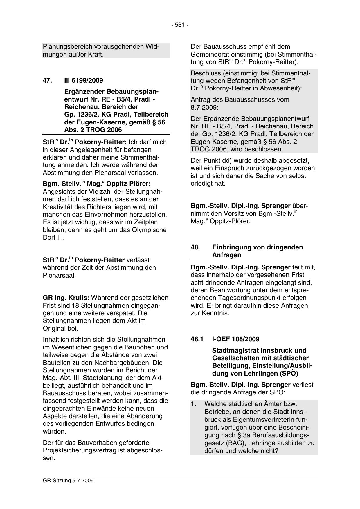 Gemeinderat einstimmig (bei Stimmenthaltung von StRin Dr.in Pokorny-Reitter):