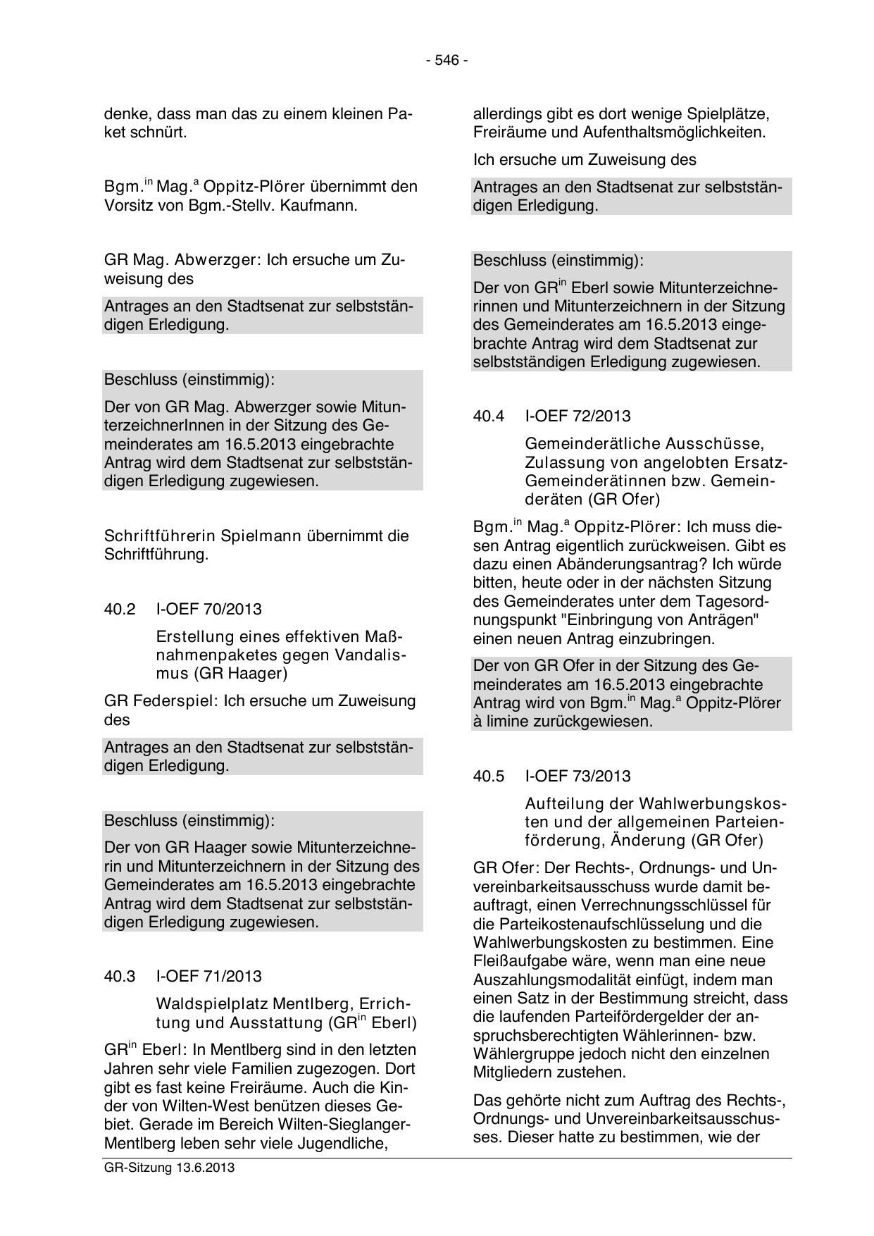 Der von GR Ofer in der Sitzung des Gemeinderates am 16.5.2013 eingebrachte