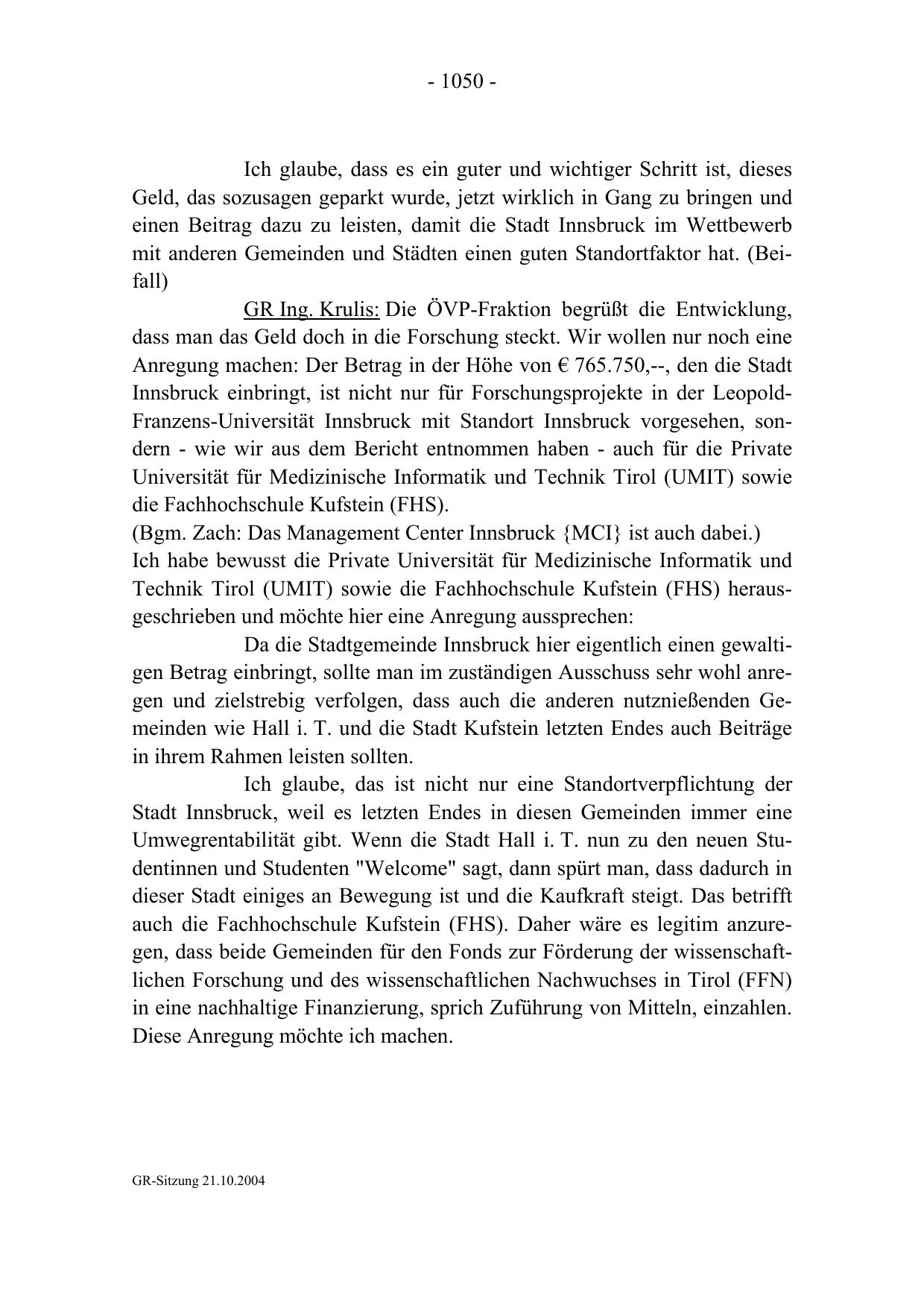 Da die Stadtgemeinde Innsbruck hier eigentlich einen gewaltigen Betrag einbringt, sollte man im zuständigen Ausschuss sehr wohl anregen und zielstrebig verfolgen, dass auch die anderen nutznießenden Gemeinden wie Hall i. T. und die Stadt Kufstein letzten Endes auch Beiträge