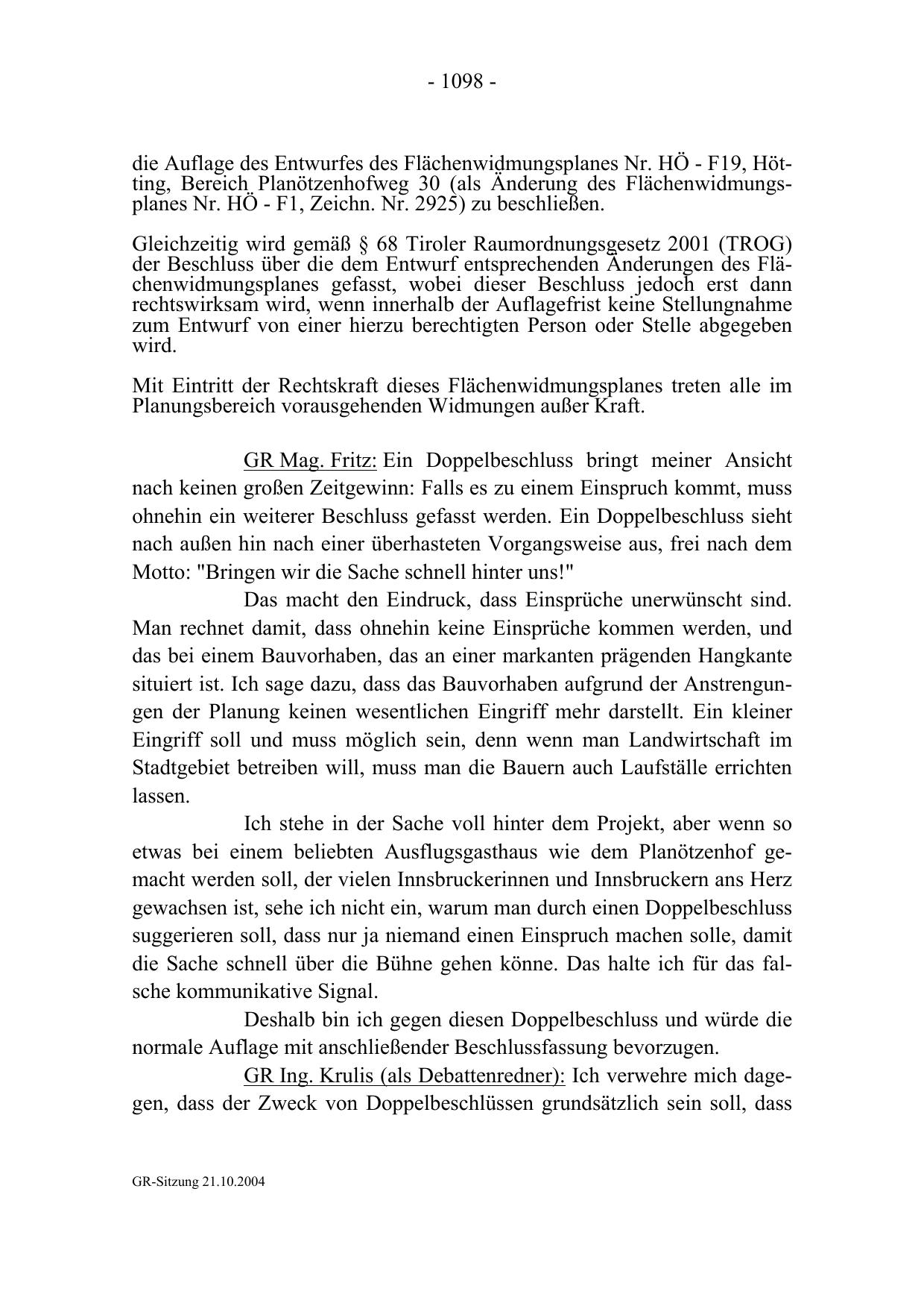 GR Ing. Krulis (als Debattenredner): Ich verwehre mich dagegen, dass der Zweck von Doppelbeschlüssen grundsätzlich sein soll, dass