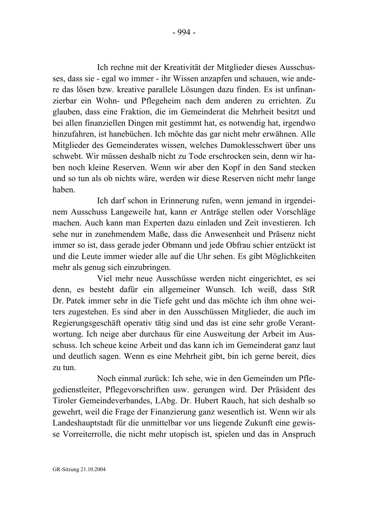Regierungsgeschäft operativ tätig sind und das ist eine sehr große Verantwortung. Ich neige aber durchaus für eine Ausweitung der Arbeit im Ausschuss. Ich scheue keine Arbeit und das kann ich im Gemeinderat ganz laut