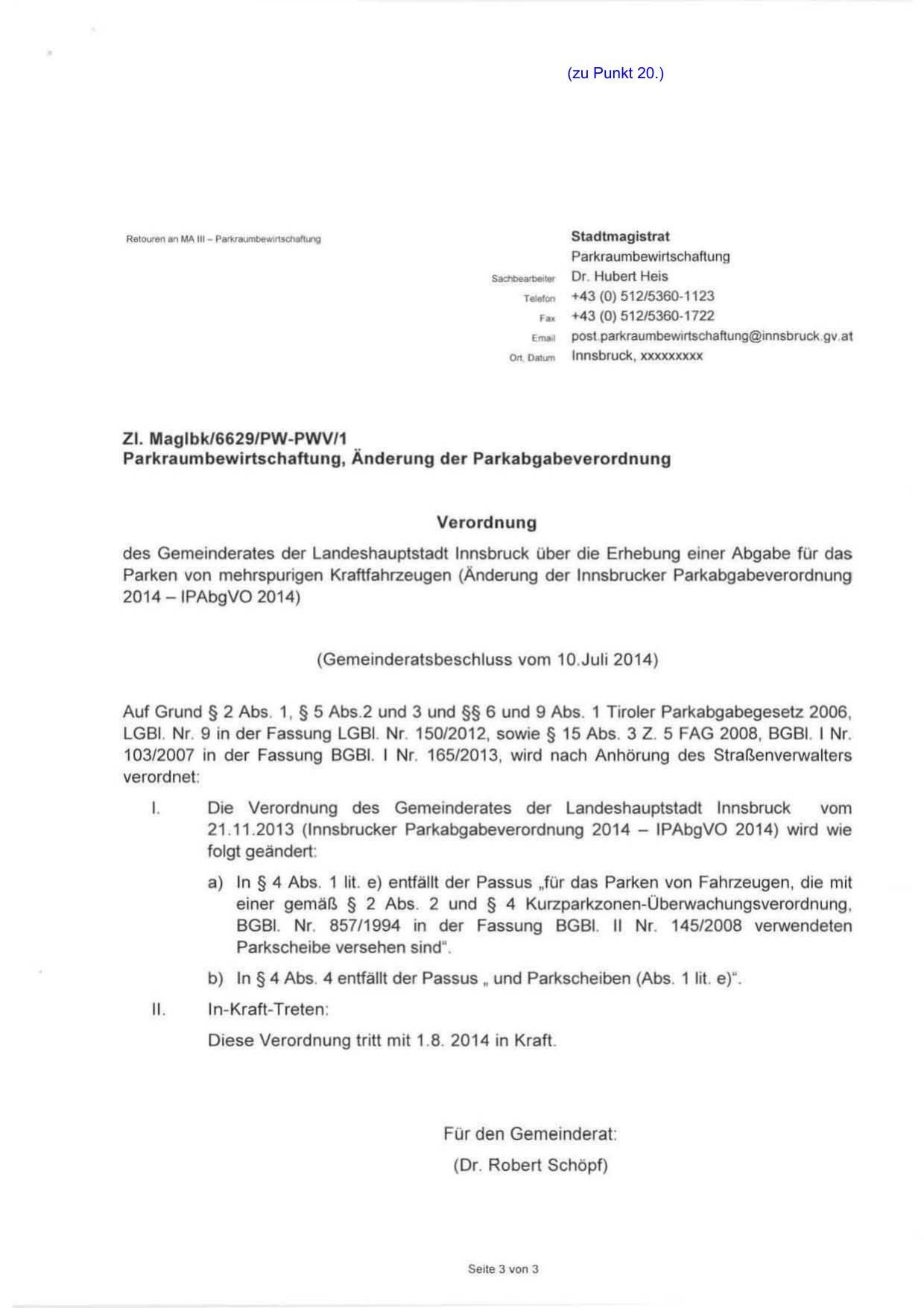 21 .11 .2013 (Innsbrucker Parkabgabeverordnung 2014 - IPAbgVO 2014) wird wie
