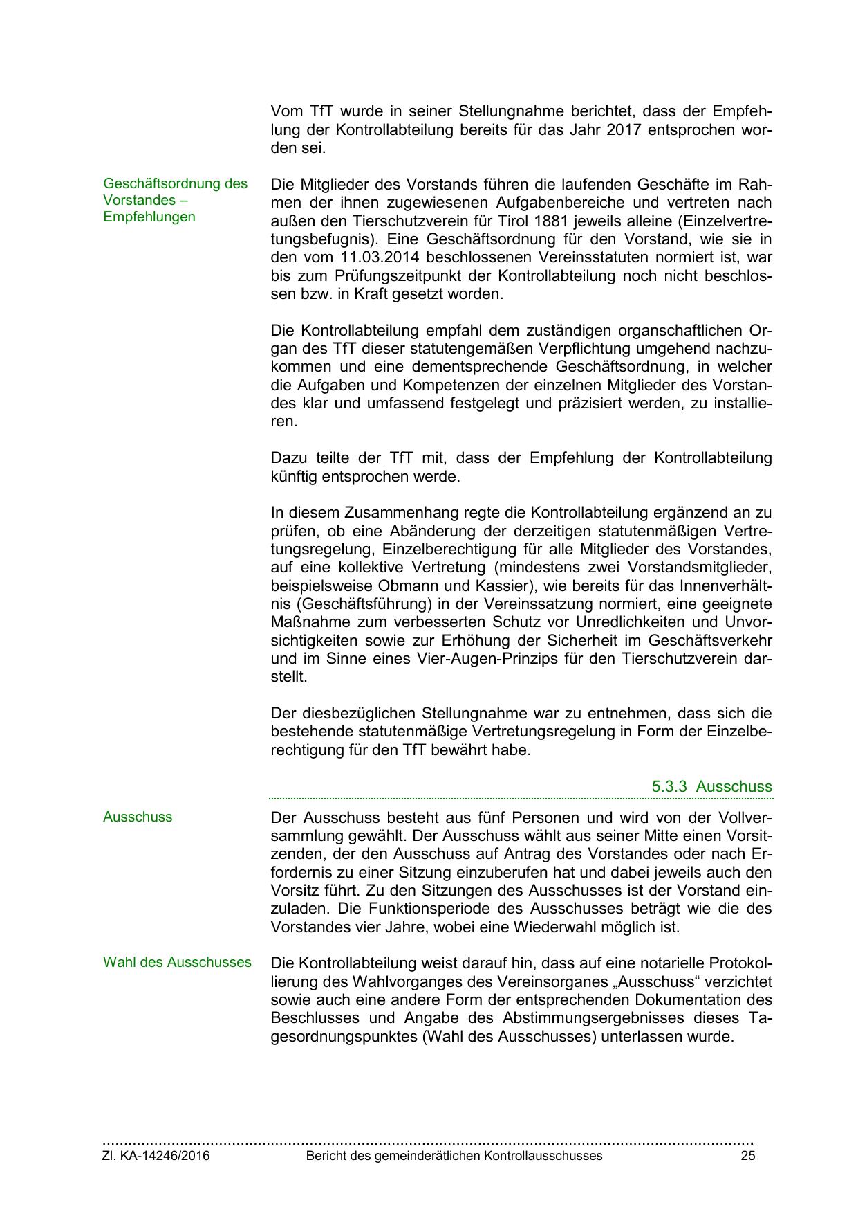 Die Kontrollabteilung empfahl dem zuständigen organschaftlichen Organ des TfT dieser statutengemäßen Verpflichtung umgehend nachzukommen und eine dementsprechende Geschäftsordnung, in welcher