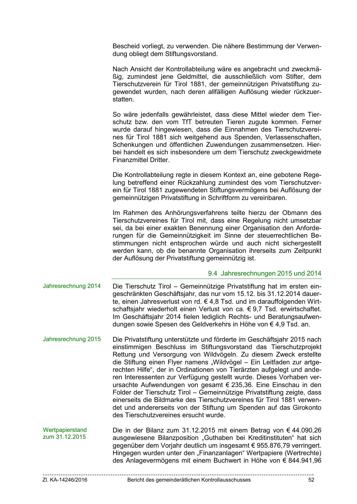 Die Tierschutz Tirol – Gemeinnützige Privatstiftung hat im ersten eingeschränkten Geschäftsjahr, das nur vom 15.12. bis 31.12.2014 dauerte, einen Jahresverlust von rd. € 4,8 Tsd. und im darauffolgenden Wirtschaftsjahr wiederholt einen Verlust von ca. € 9,7 Tsd. erwirtschaftet.
