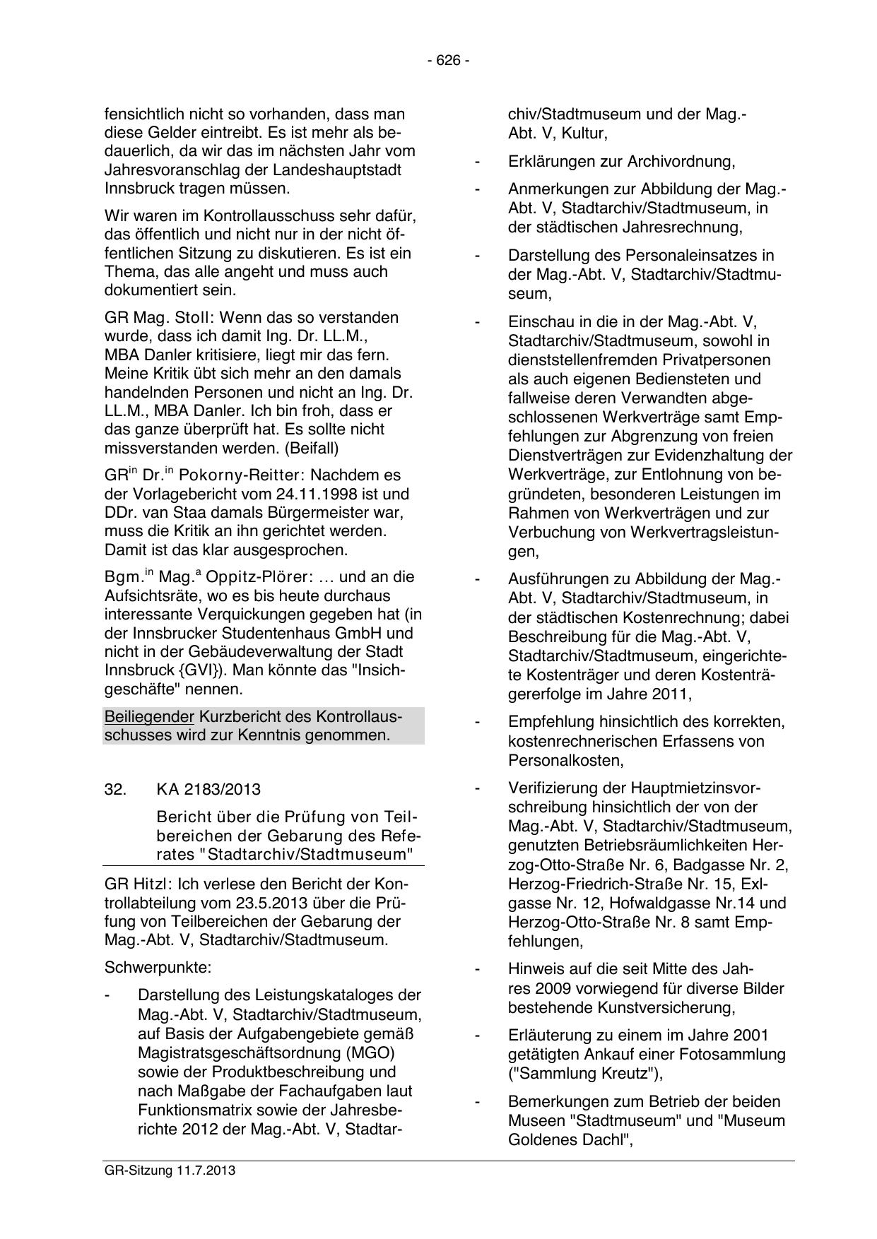 GR Hitzl: Ich verlese den Bericht der Kontrollabteilung vom 23.5.2013 über die Prüfung von Teilbereichen der Gebarung der