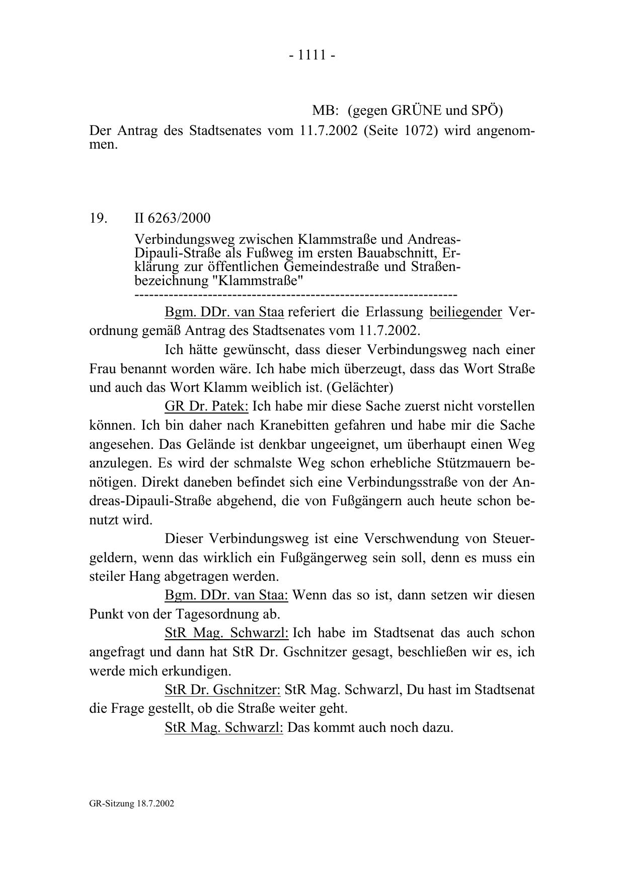 Der Antrag des Stadtsenates vom 11.7.2002 (Seite 1072) wird angenommen.