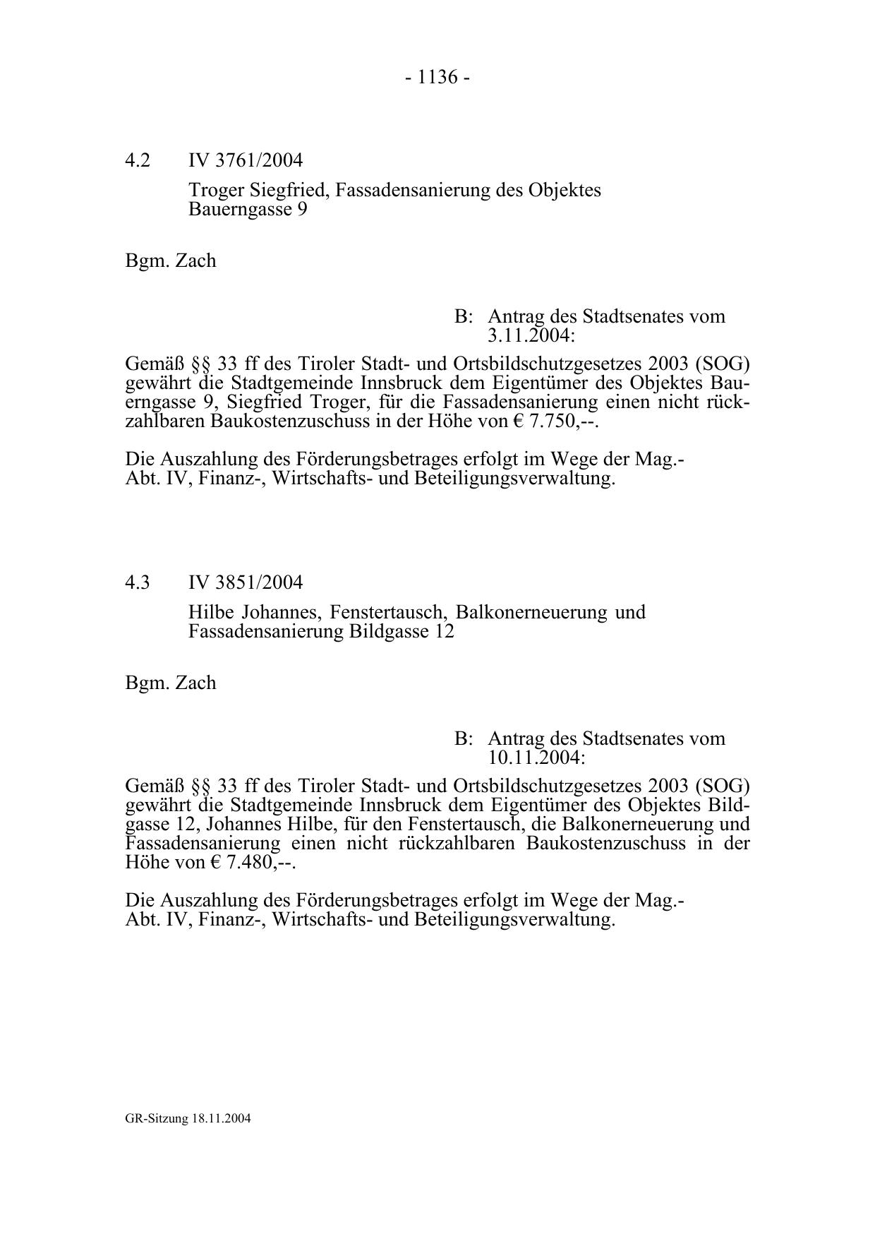 gewährt die Stadtgemeinde Innsbruck dem Eigentümer des Objektes Bauerngasse 9, Siegfried Troger, für die Fassadensanierung einen nicht rückzahlbaren Baukostenzuschuss in der Höhe von € 7.750,--.