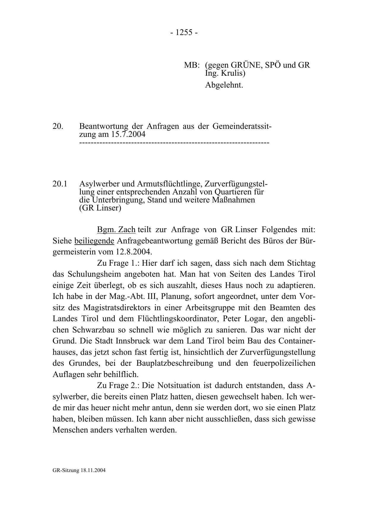 Beantwortung der Anfragen aus der Gemeinderatssitzung am 15.7.2004