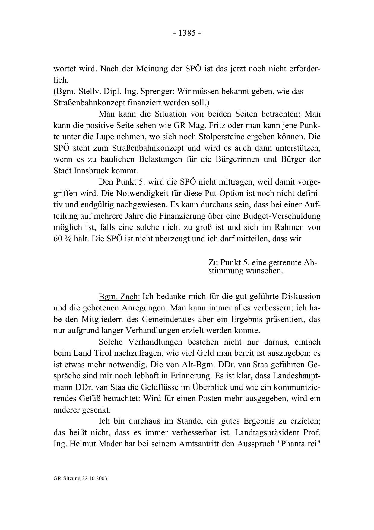 ist etwas mehr notwendig. Die von Alt-Bgm. DDr. van Staa geführten Gespräche sind mir noch lebhaft in Erinnerung. Es ist klar, dass Landeshauptmann DDr. van Staa die Geldflüsse im Überblick und wie ein kommunizierendes Gefäß betrachtet: Wird für einen Posten mehr ausgegeben, wird ein