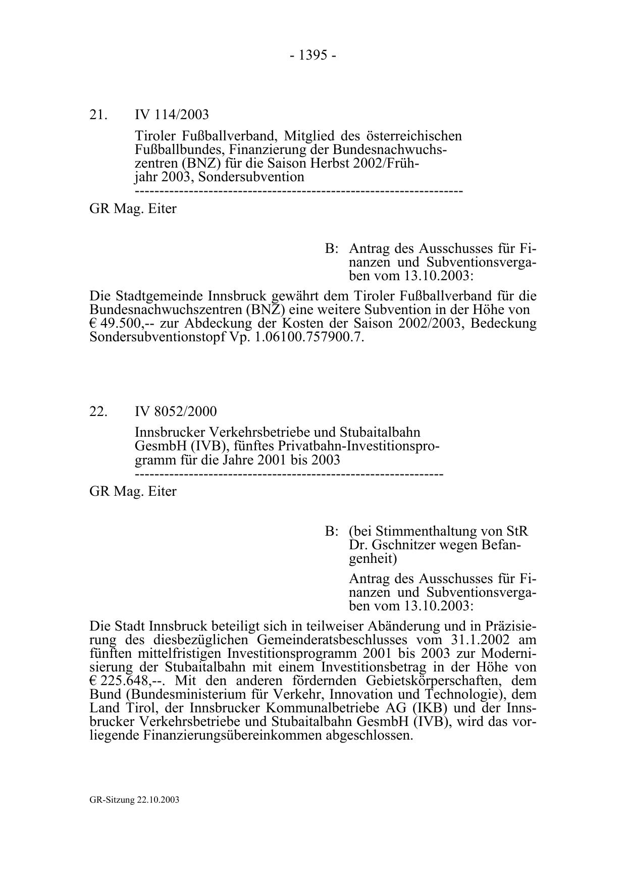 Die Stadt Innsbruck beteiligt sich in teilweiser Abänderung und in Präzisierung des diesbezüglichen Gemeinderatsbeschlusses vom 31.1.2002 am