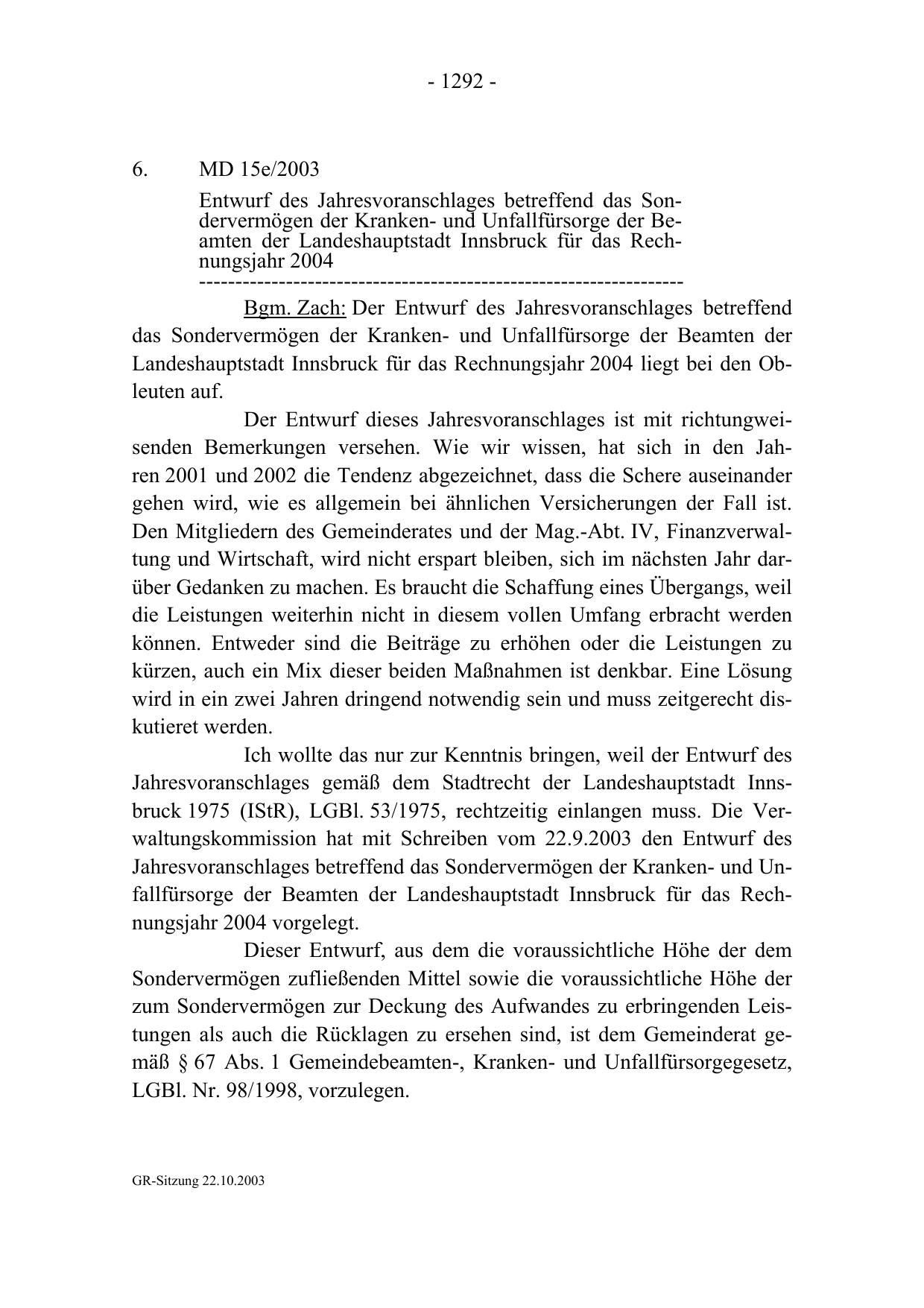 Jahresvoranschlages gemäß dem Stadtrecht der Landeshauptstadt Innsbruck 1975 (IStR), LGBl. 53/1975, rechtzeitig einlangen muss. Die Verwaltungskommission hat mit Schreiben vom 22.9.2003 den Entwurf des