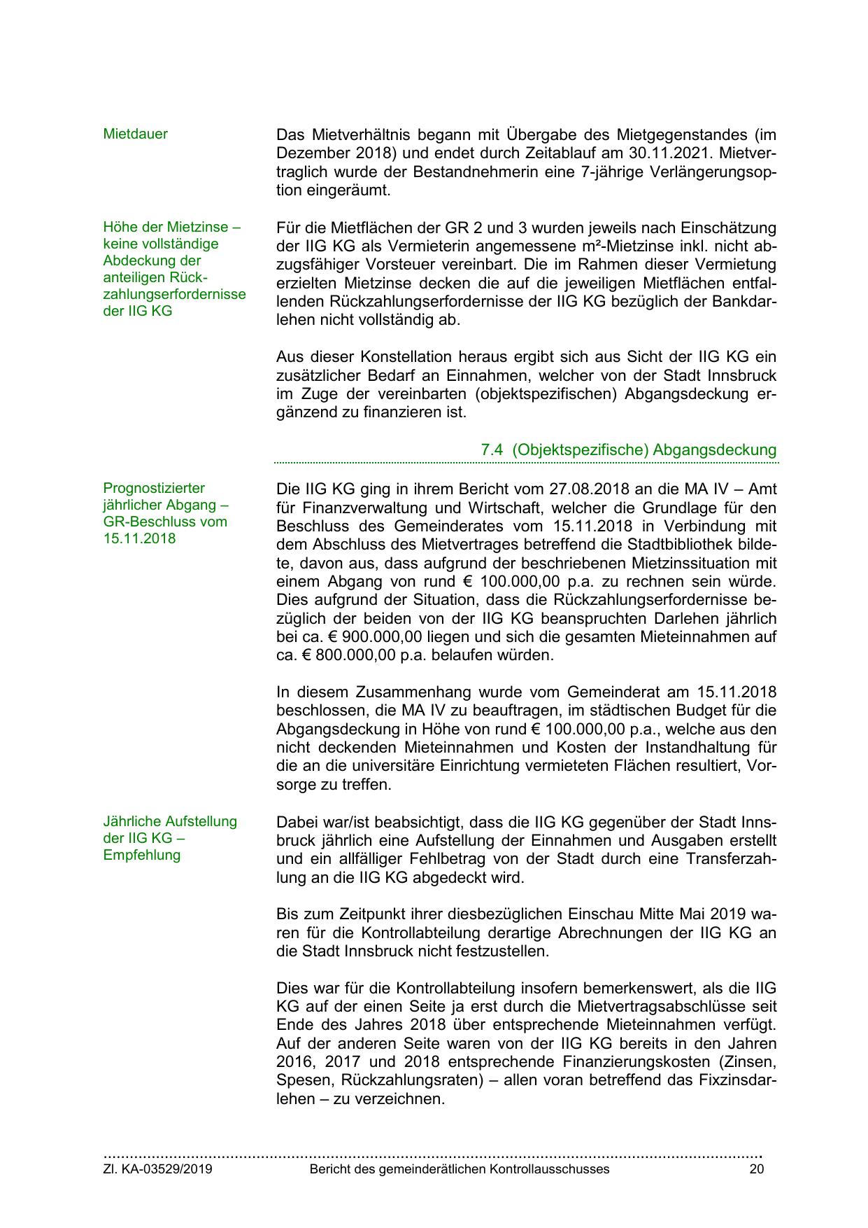 Dabei war/ist beabsichtigt, dass die IIG KG gegenüber der Stadt Innsbruck jährlich eine Aufstellung der Einnahmen und Ausgaben erstellt