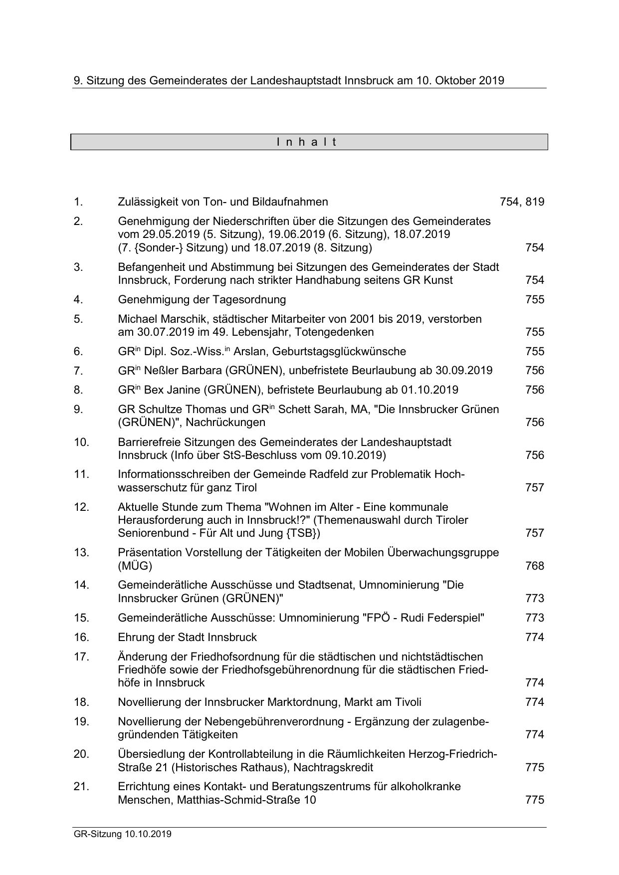 9. Sitzung des Gemeinderates der Landeshauptstadt Innsbruck am 10. Oktober 2019