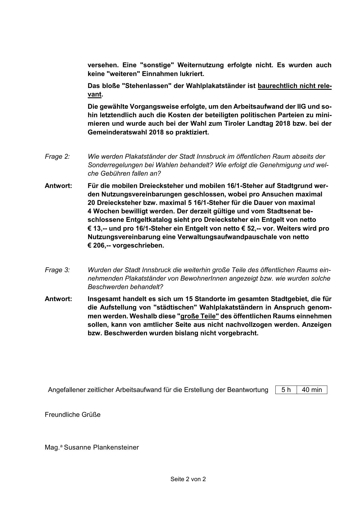 Wurden der Stadt Innsbruck die weiterhin große Teile des öffentlichen Raums einnehmenden Plakatständer von BewohnerInnen angezeigt bzw. wie wurden solche