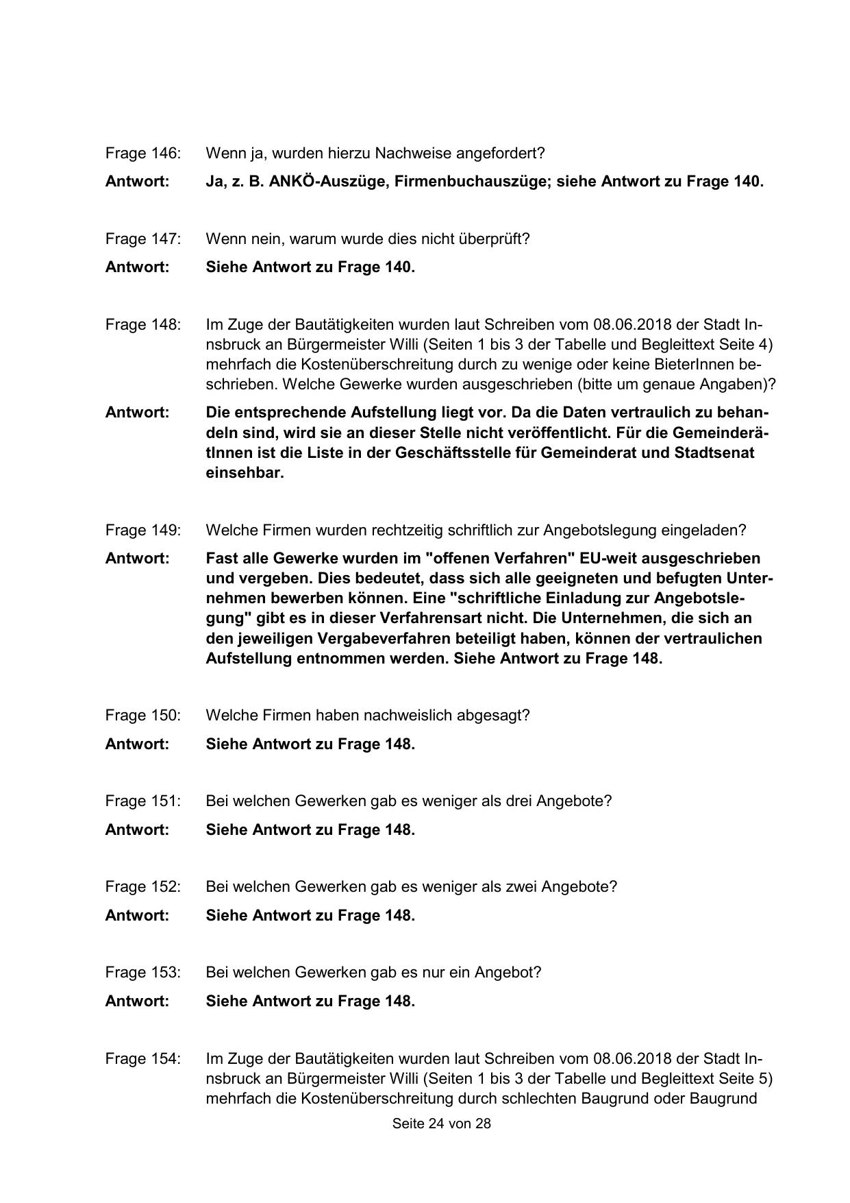 Im Zuge der Bautätigkeiten wurden laut Schreiben vom 08.06.2018 der Stadt Innsbruck an Bürgermeister Willi (Seiten 1 bis 3 der Tabelle und Begleittext Seite 4)
