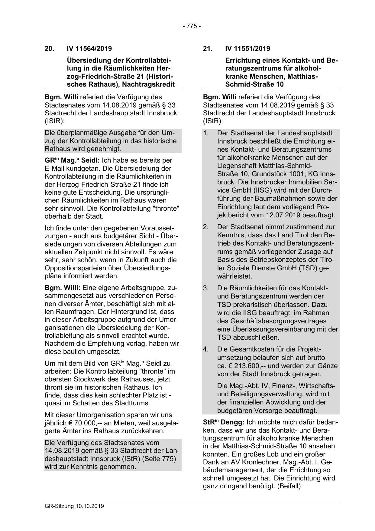 14.08.2019 gemäß § 33 Stadtrecht der Landeshauptstadt Innsbruck (IStR) (Seite 775)