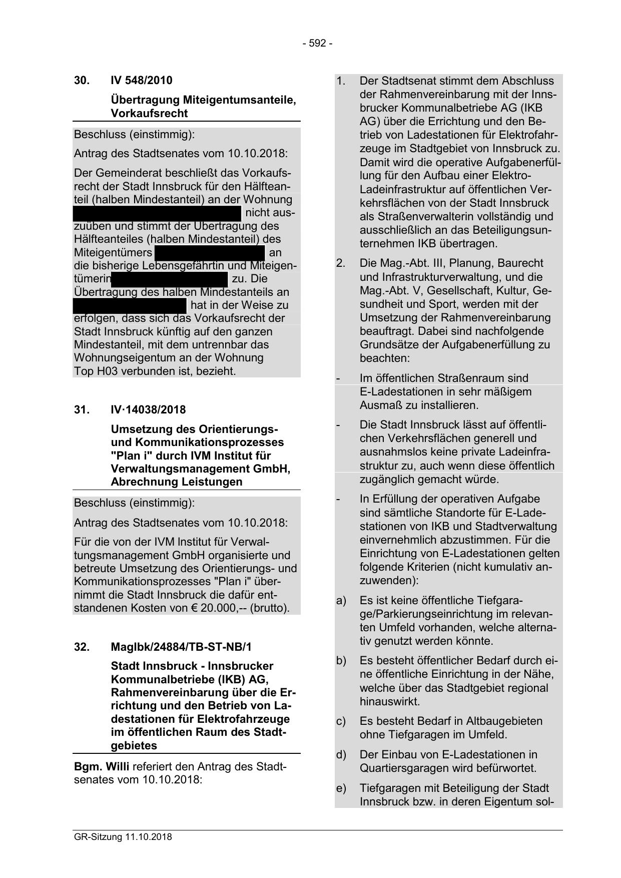 Der Gemeinderat beschließt das Vorkaufsrecht der Stadt Innsbruck für den Hälfteanteil (halben Mindestanteil) an der Wohnung