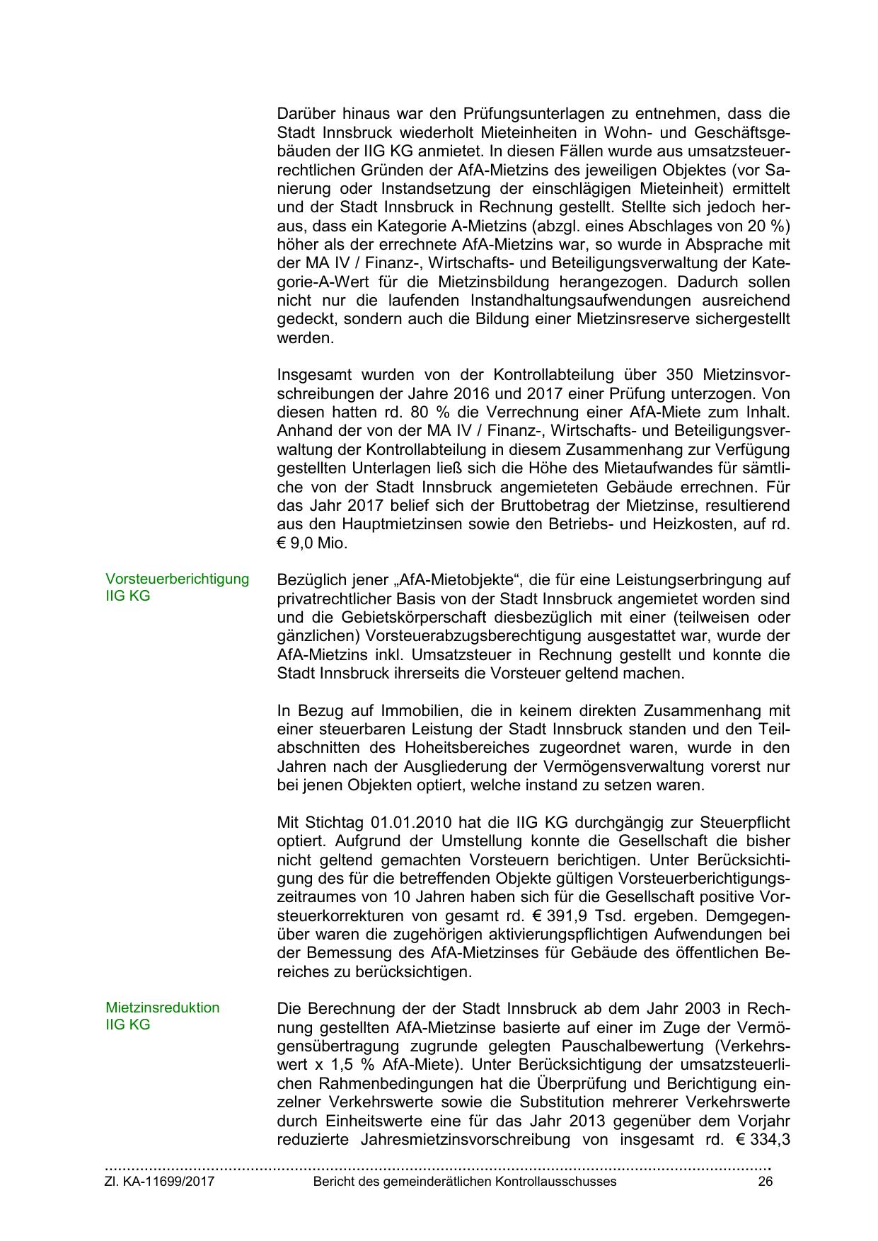 Stadt Innsbruck wiederholt Mieteinheiten in Wohn- und Geschäftsgebäuden der IIG KG anmietet. In diesen Fällen wurde aus umsatzsteuerrechtlichen Gründen der AfA-Mietzins des jeweiligen Objektes (vor Sanierung oder Instandsetzung der einschlägigen Mieteinheit) ermittelt