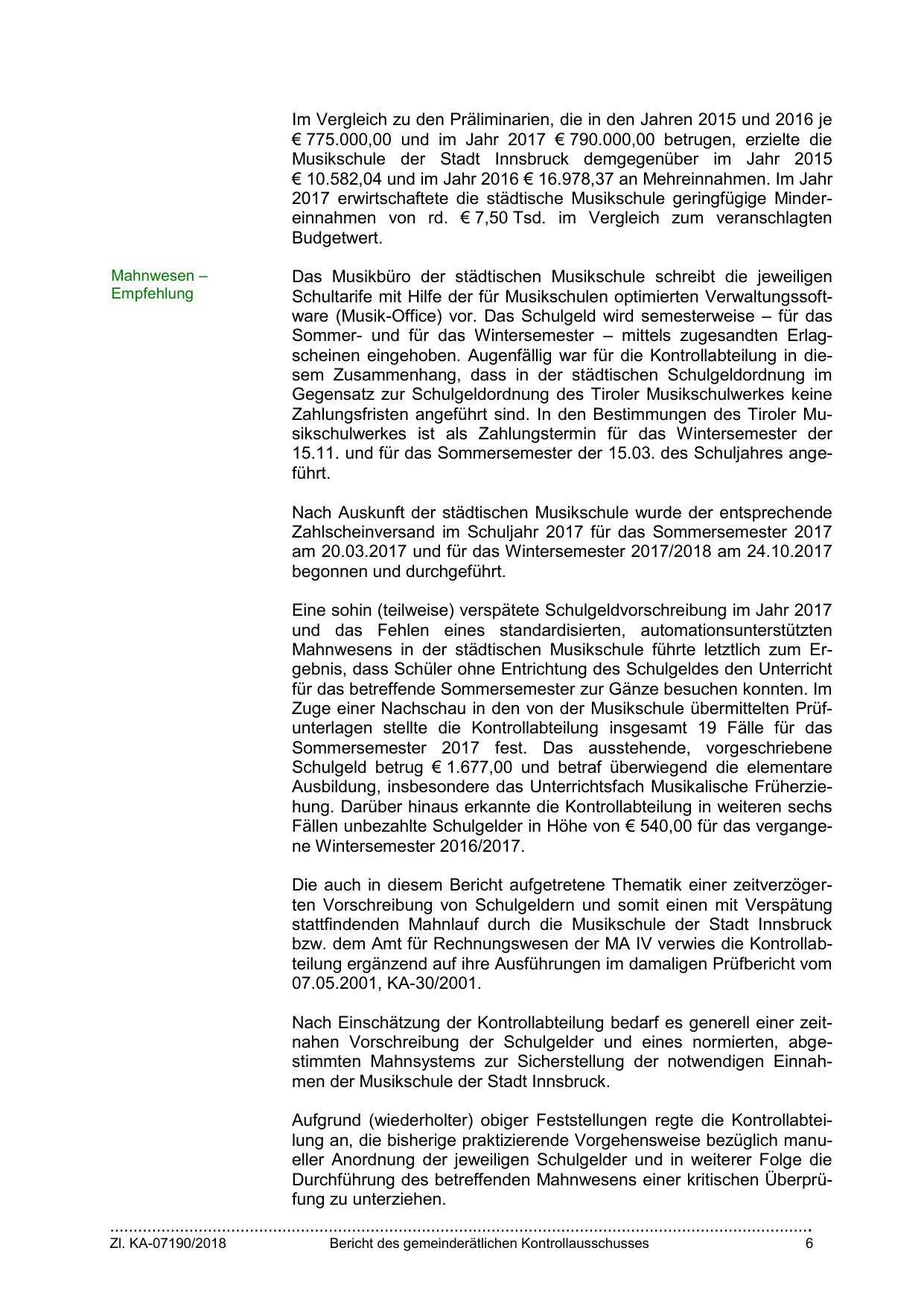 Nach Einschätzung der Kontrollabteilung bedarf es generell einer zeitnahen Vorschreibung der Schulgelder und eines normierten, abgestimmten Mahnsystems zur Sicherstellung der notwendigen Einnahmen der Musikschule der Stadt Innsbruck.