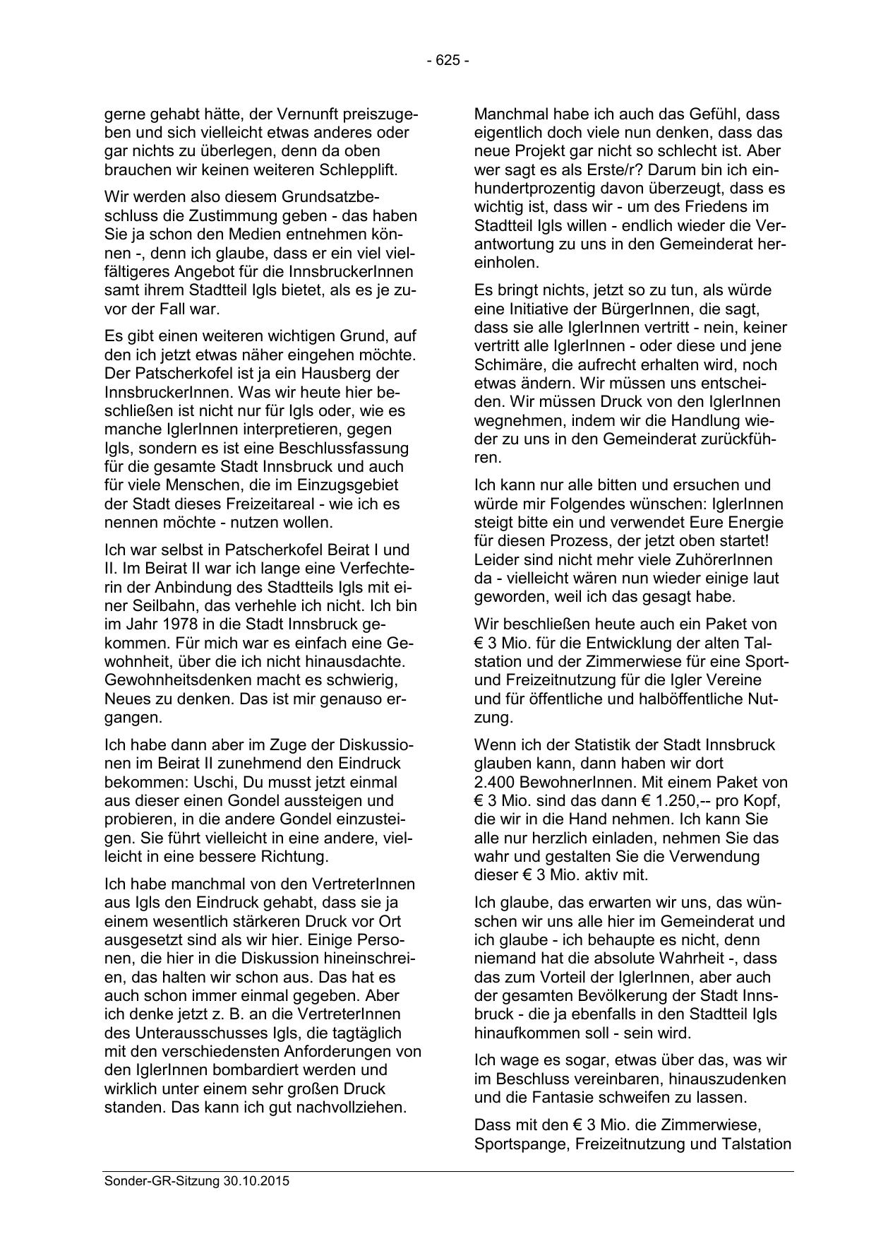 II. Im Beirat II war ich lange eine Verfechterin der Anbindung des Stadtteils Igls mit einer Seilbahn, das verhehle ich nicht. Ich bin