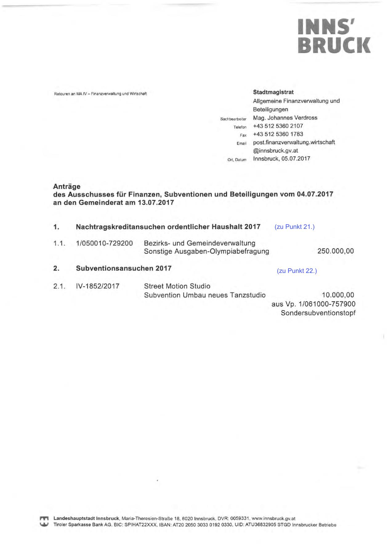 61 Tiroler Sparkasse BankAG , sie: SPIHAT22XXX , IBAN: AT20 2050 3033 0192 0330 , UID: ATU36832905 STGD Innsbrucker Betriebe