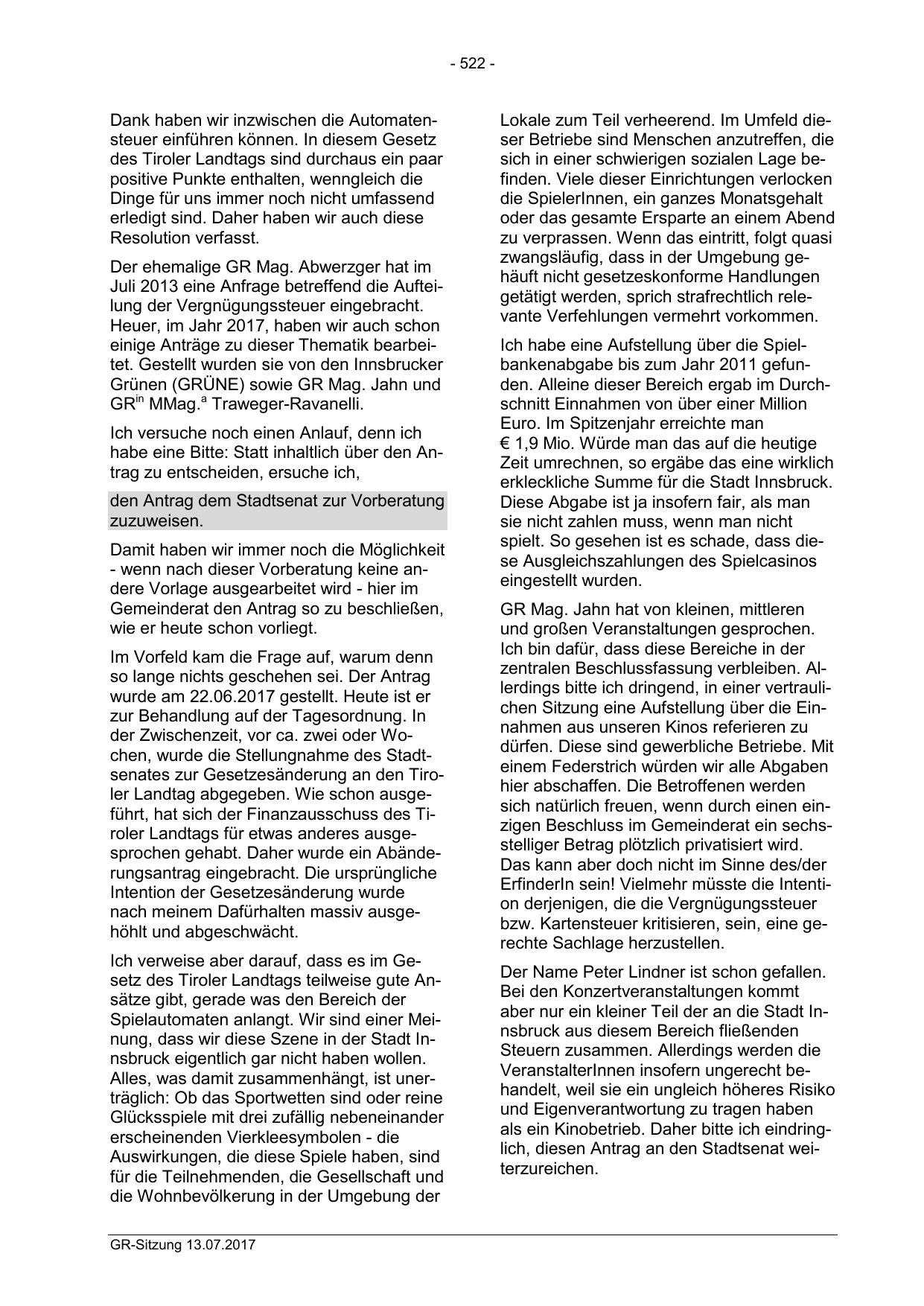 Spielautomaten anlangt. Wir sind einer Meinung, dass wir diese Szene in der Stadt Innsbruck eigentlich gar nicht haben wollen.