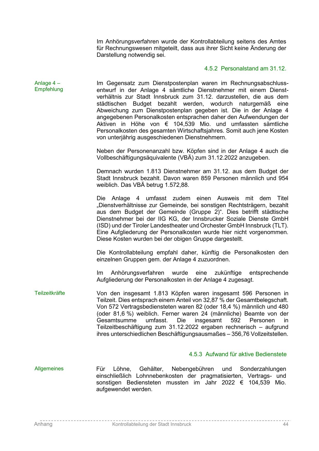 Im Gegensatz zum Dienstpostenplan waren im Rechnungsabschlussentwurf in der Anlage 4 sämtliche Dienstnehmer mit einem Dienstverhältnis zur Stadt Innsbruck zum 31.12. darzustellen, die aus dem